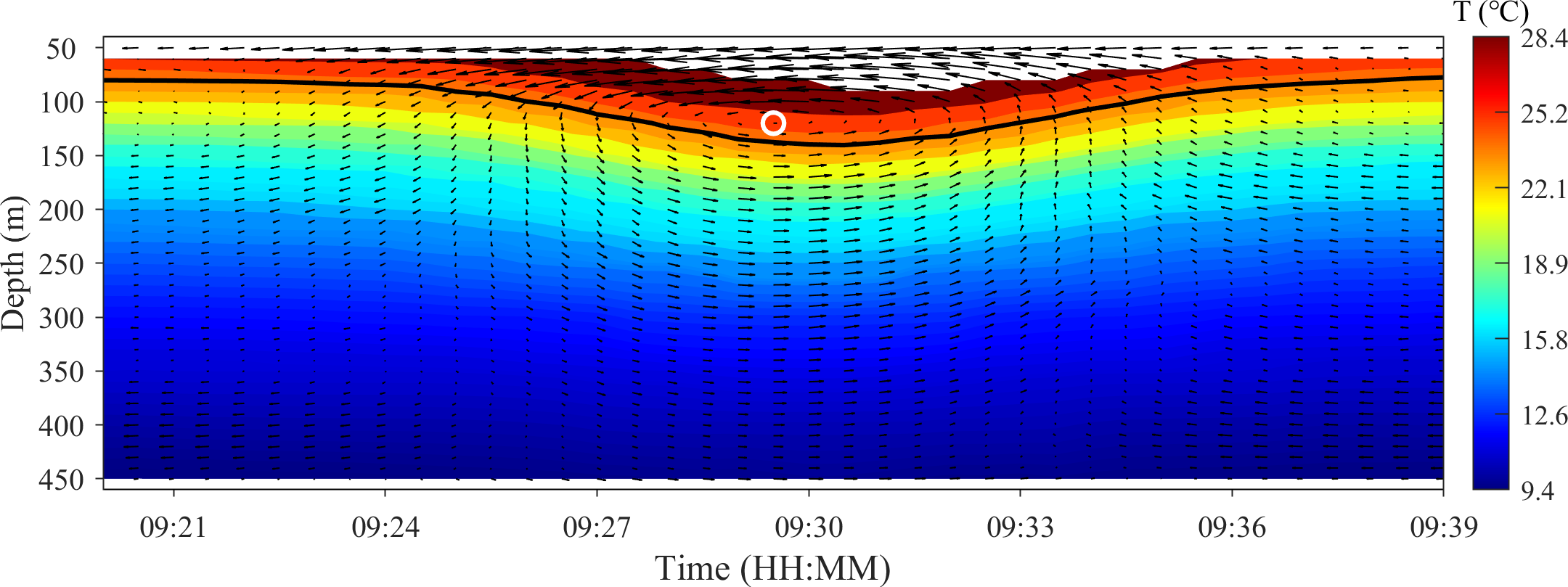 Vector arrows of the ISW current in Figure 7 and the profile of temperature oscillation during the occurrence of the ISW. The black curve represents the waveform with maximum amplitude. The white circle represents the grid points that satisfy all the constraints, corresponding to the red circle in Figure 7C.