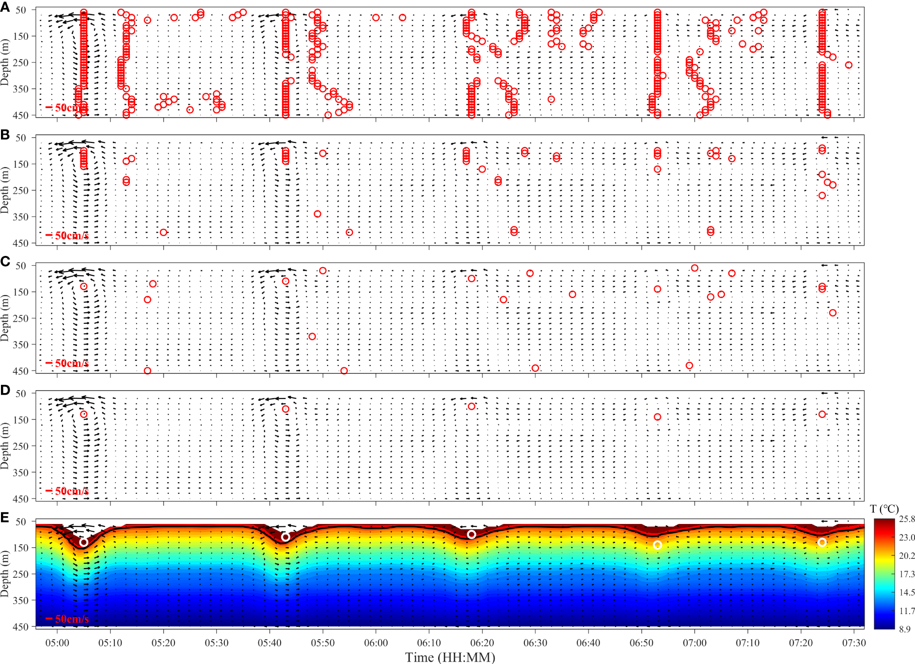 The (A) first, (B) second, (C) third, and (D) fourth constraints applied to the measured current field of the ISW packet observed at mooring B on 19 September 2018. The red circles in each subgraph represent the grid points that satisfy the constraints ( ). (E) Vector arrows of the ISW current and the profile of temperature oscillation during the occurrence of the ISW packet. The black curve represents the waveforms with maximum amplitude. The white circles represent the grid points that satisfy all the constraints, corresponding to the red circles in (D).