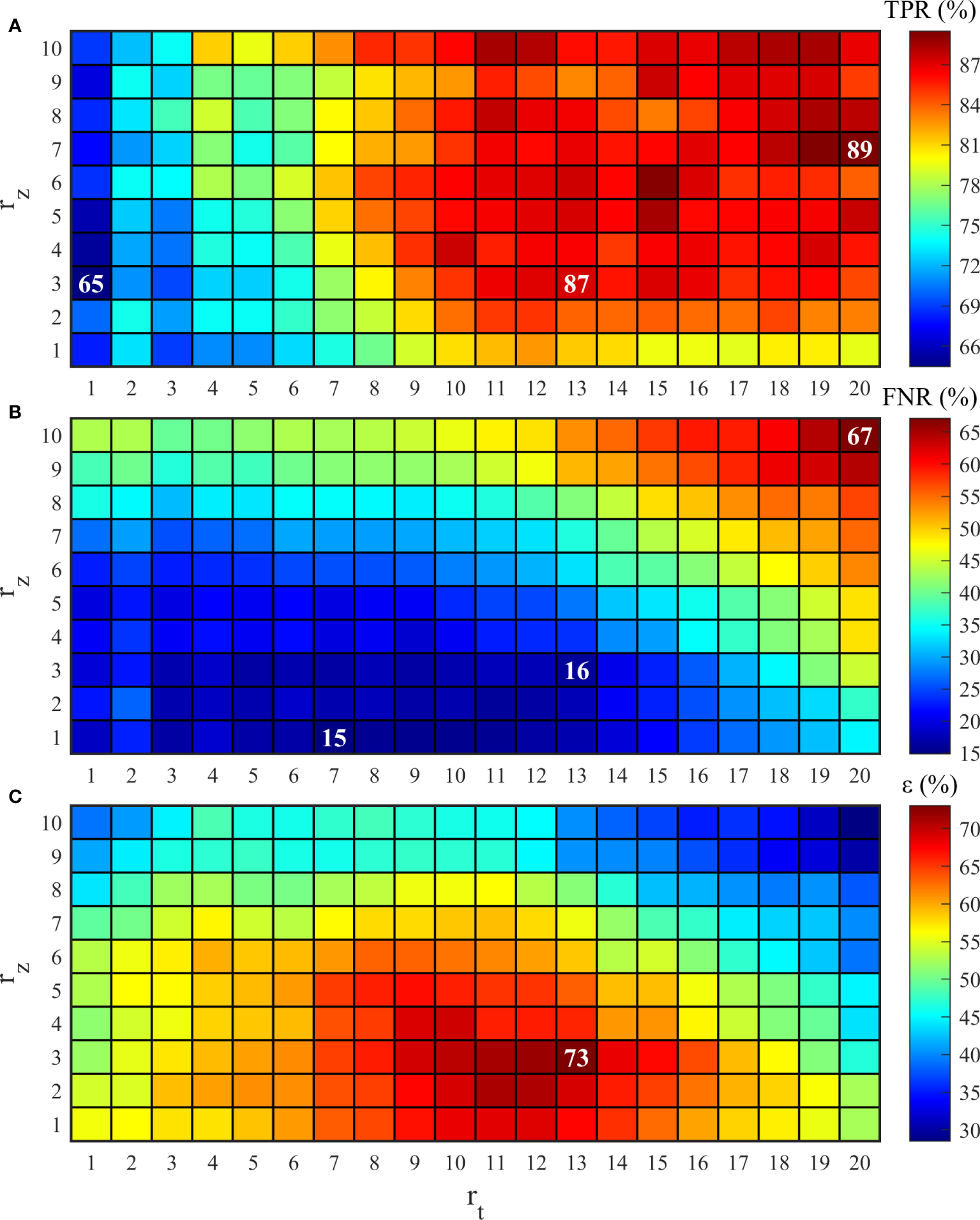 It can be observed that for a given value of , a gradual decrease was observed in with the increase in (Figure 11A), whereas increased with the increase in both and (Figure 11B). reached its maximum at and (Figure 11C). Finally, the optimal parameter combination of and was obtained through the sensitivity experiments, within the detection range of 13 min×60 m. The and of the ISW identification algorithm were 87.2% and 16.3%, respectively.