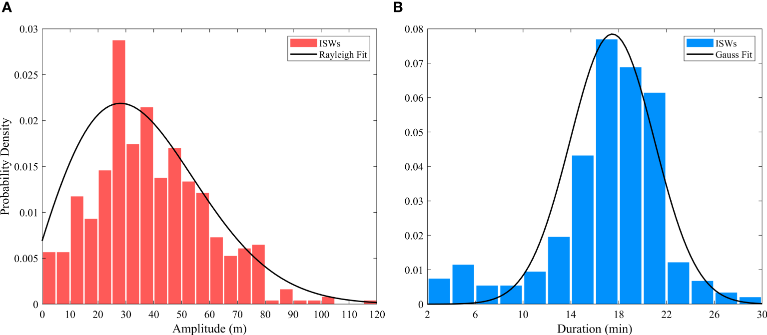 Probability density distributions of the (A) amplitudes and (B) duration of the ISWs identified by the algorithm.