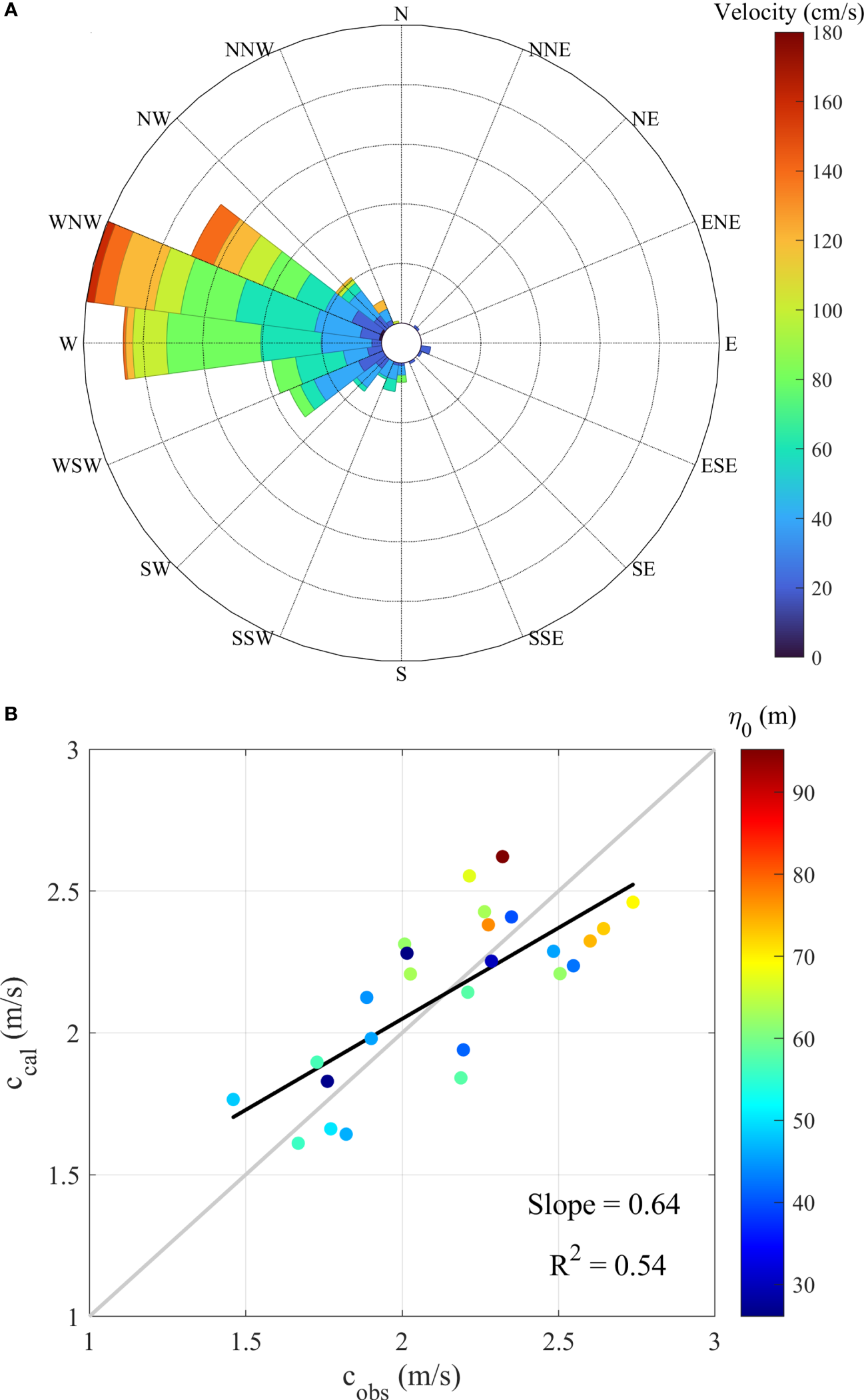 (A) Joint distribution of maximum current velocities and propagation directions of ISWs identified by the algorithm. (B) Comparison of measured () propagation velocities of the ISWs with different amplitudes () and those calculated by the algorithm (). R-squared () and slope of linear fit (black line) of the plots between and are represented.