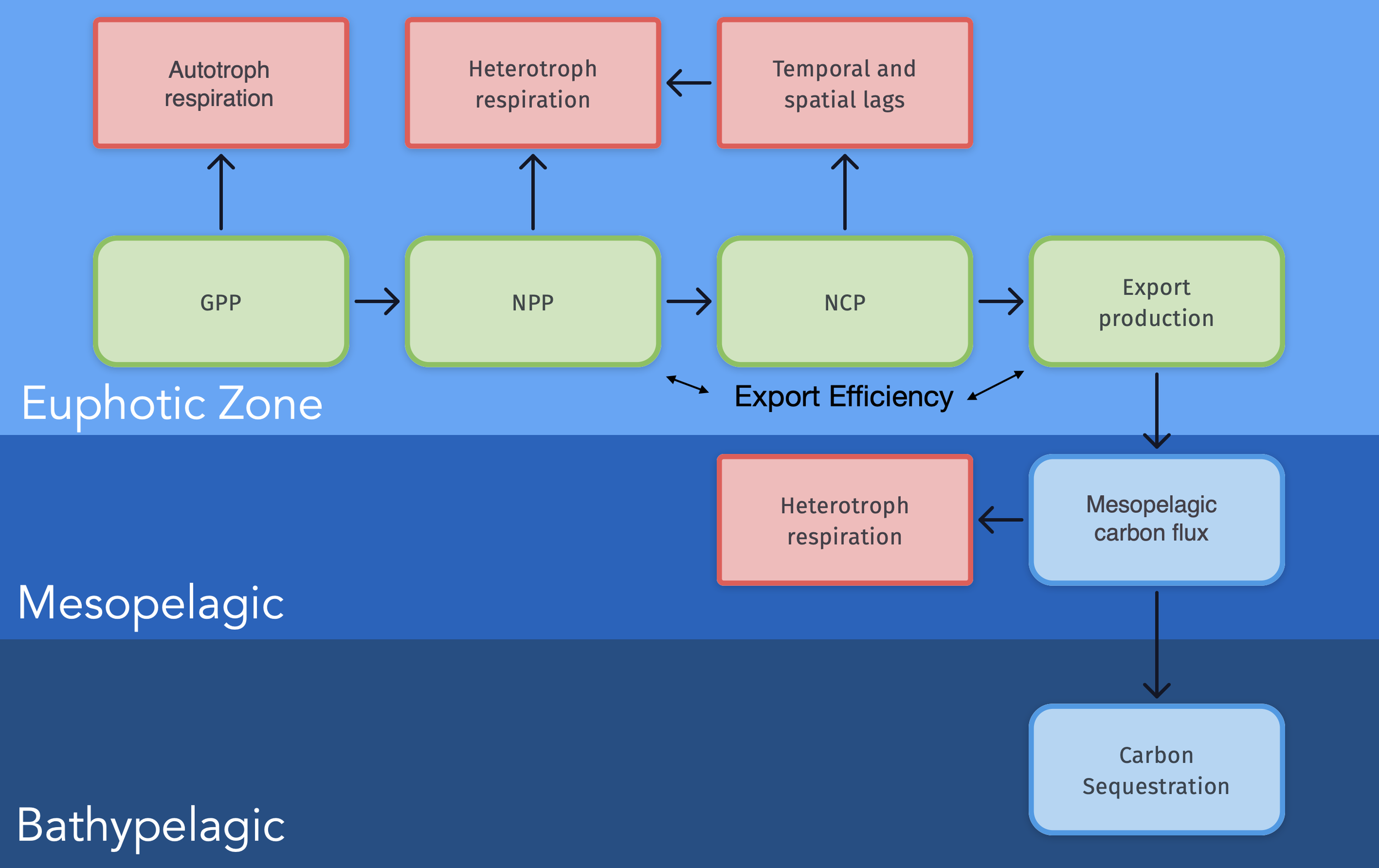 Export Production (EP, Laws, 1991) is the net production of organic carbon above a specified horizon and is assumed to be equivalent with NCP when the system is in steady-state and all temporal lags are accounted for. EP is an important property for the global carbon cycle by constraining the sequestration of organic carbon to deeper waters. EP is by definition only valid over significantly longer timescales than any processes directly controlling production and respiration. Hence, it is not possible to directly convert In-situ measurements of mixed layer NCP to EP since the newly-produced biomass might be consumed before it can be exported to the aphotic zone. It is also not yet possible to derive mechanistic relationships between EP satellite-based products. EP serves as the upper bound for transport of POC from the euphotic zone to the bathypelgic (e.g. Platt et al., 1989; Siegel et al., 2016; Siegel et al., 2022).