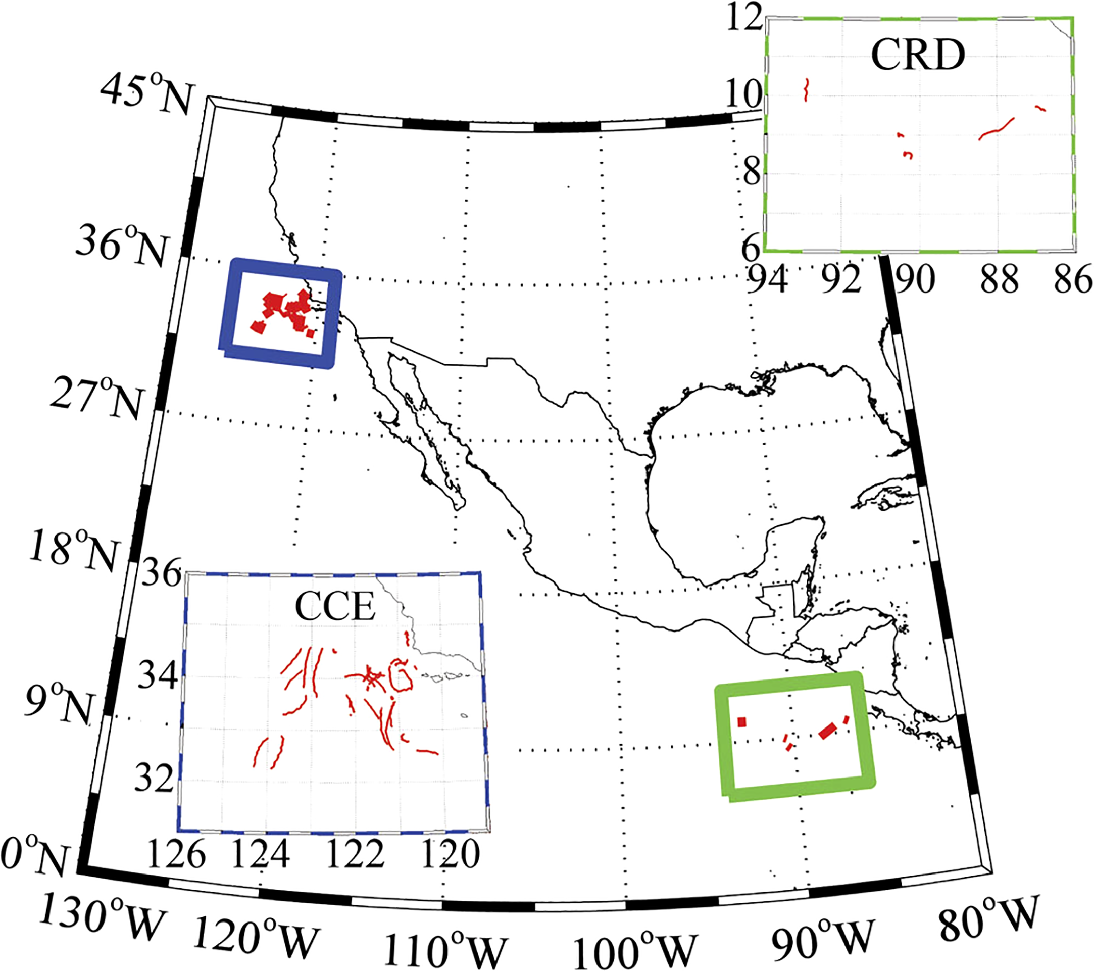 Lagrangian experiment locations in the Stukel et al. (2015) study. CCE drifter tracks (blue box, upper right). CRD drifter tracks (green box, lower left). Image from Stukel et al. (2015).