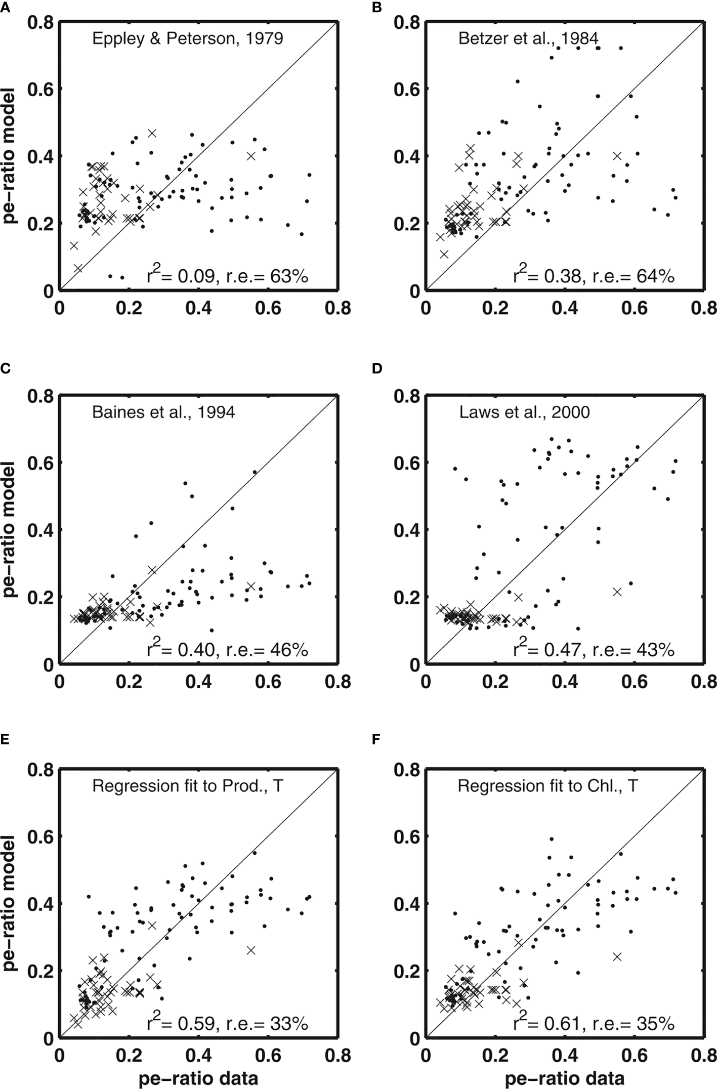 The instrumental Dunne et al. (2005) study provided not only relationships between PP or Chl and EP that are widely used in ecosystem modeling, but also comparisons of a variety of empirical parameterizations with the data synthesis described in section 3.1. The observed pe-ratios were combined with in-situ observations of mixed layer temperature, depth-integrated chlorophyll, depth-integrated PP, new production, particle export, depth of the euphotic zone (minimum of the 1% light level or sampling zone), and the carbon-to-chlorophyll ratio. They found that the Eppley and Peterson (1979), (Figure 5A) algorithm has the lowest coefficient of determination (9%), which they attributed to the parameterization relying on the integral of PP alone. The Baines et al. (1994), (Figure 5B) algorithm added euphotic zone depth in addition to the depth-integral of PP and was able to account for a higher fraction of the variance (38%), while not improving the relative uncertainty (64%). A different approach was used by Baines et al. (1994), (Figure 5C) where chlorophyll concentrations were utilized as the predictive variable. Their parameterization was able to account for a slightly higher variance (40%) while also decreasing the relative uncertainty (46%), but showed a strong bias to low values at higher pe-ratios. Dunne et al. (2005) found that the Laws et al. (2000), (Figure 5D) algorithm succeeded in reproducing large-scale structures in the data and accounted for nearly half of the variance (47%), while decreasing the relative error to 43%. The major shortcoming of this algorithm was in reproducing variability in pe-ratios at high temperatures. Dunne et al. (2005) suggested that “a weaker temperature dependence for phytoplankton and bacterial metabolism than for zooplankton metabolism” accounts for this misfit.