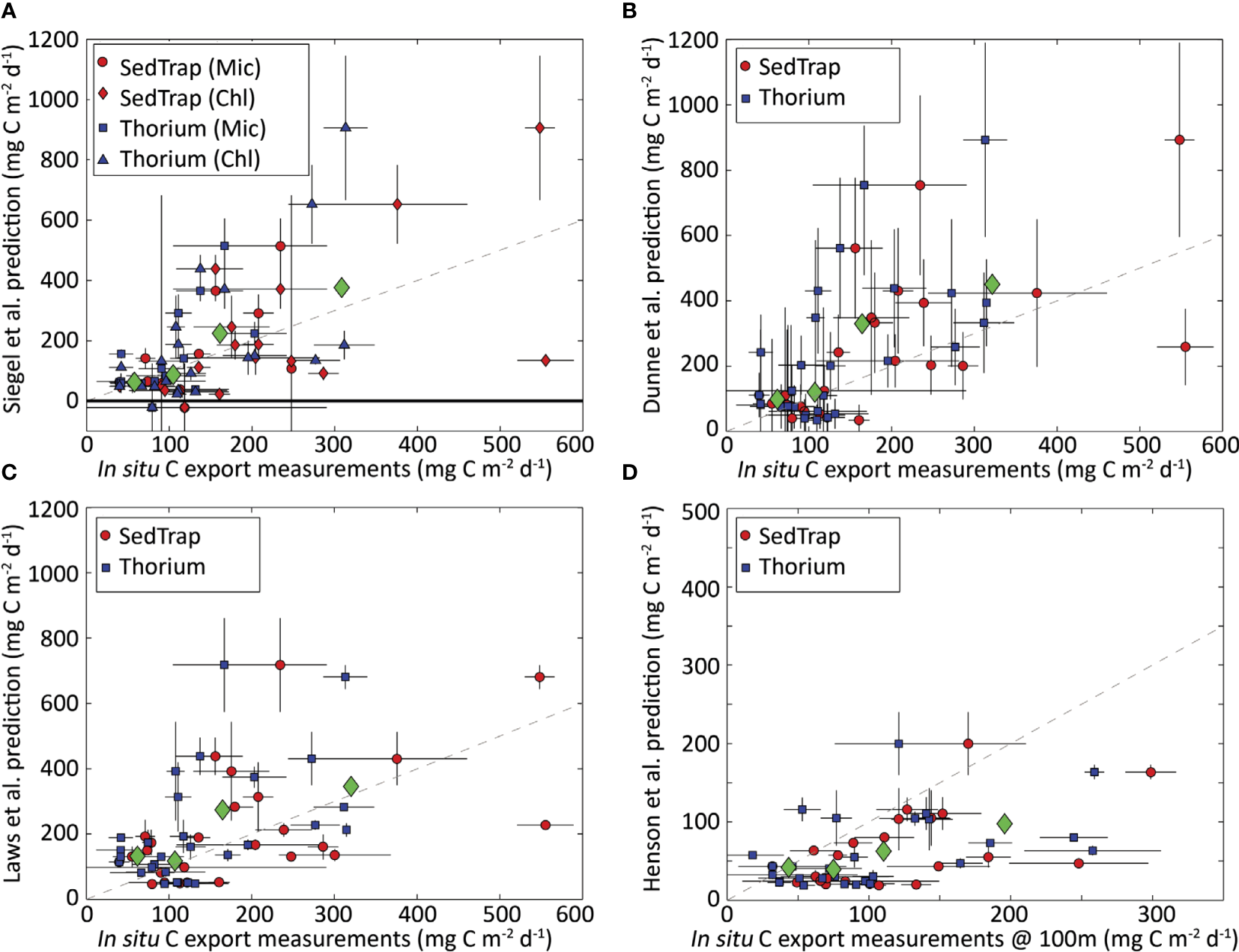 Figure 7 Comparison between satellite algorithms and in-situ measurements by Stukel et al. (2015). (A) Siegel et al. (2014) vs sediment-trap-(circles and diamonds) and 234Th-derived (squares and triangles) measurements. Circles and squares are based on results using microscopy to determine the fraction of microphytoplankton. (B–D) Dunne et al. (2005); Laws et al. (2011), and Henson et al. (2011) algorithms, respectively, with circles showing sediment trap data and squares showing 234Th data. All panels show export normalized to the base of the Zeu, except panel D, which shows export at 100m. Green diamonds show arithmetic mean of predicted and measured export for each quartile of the measurements (35-85, 85-125, 125-205, and 205-560 mg C m-2 d-1 for base of Zeu; 18-65, 65-89, 89-140, and 140-300 mg C m-2 d-1 for 100m). Dashed lines depict a 1:1 relationship. Error bars show one standard error (for in-situ measurements) and propagation of measurement standard error through satellite algorithms (for predictions). Image from Stukel et al. (2015).