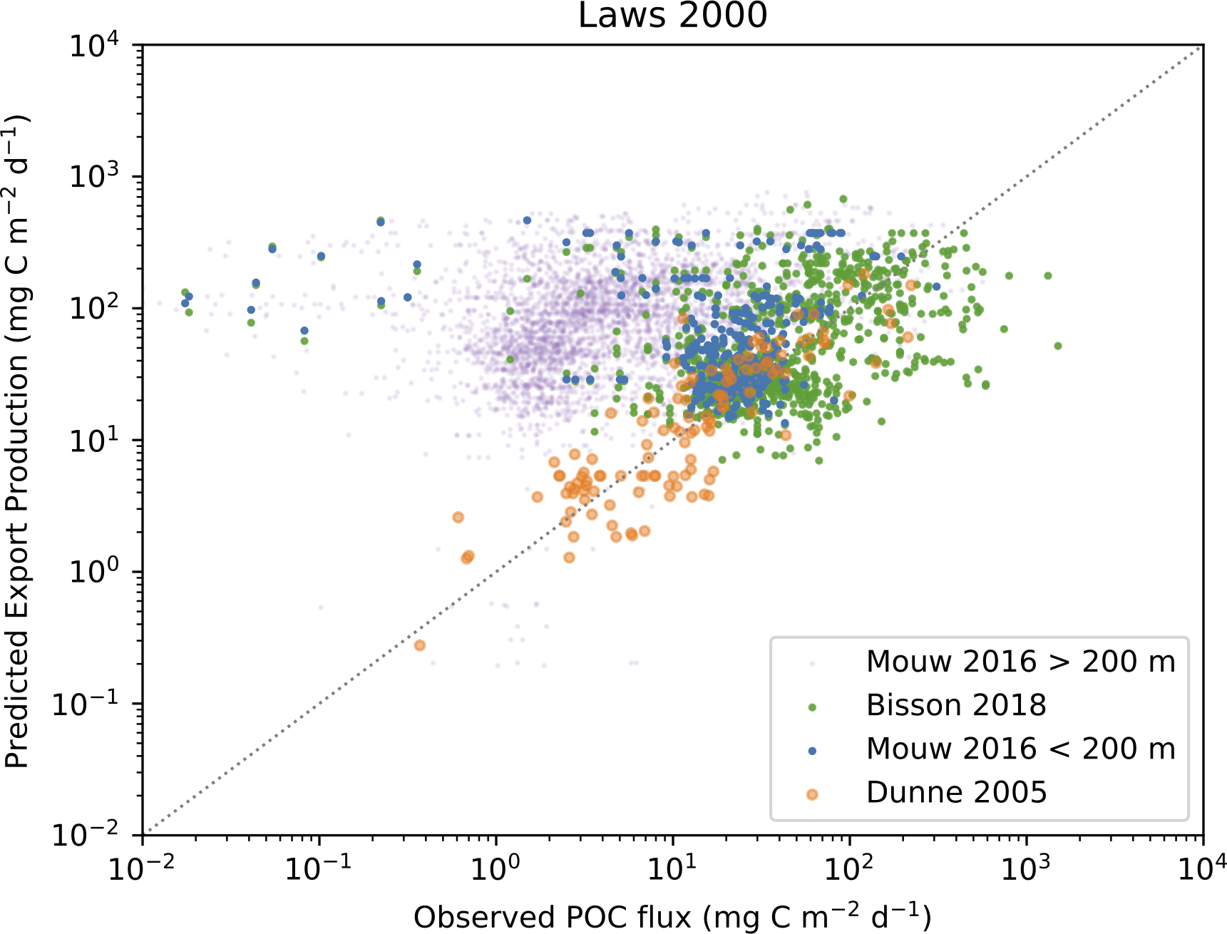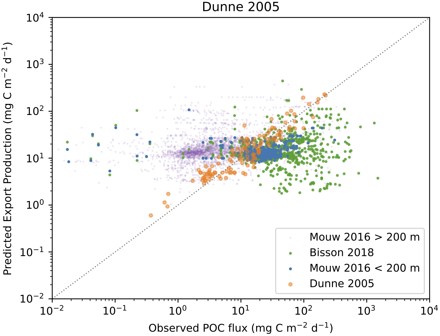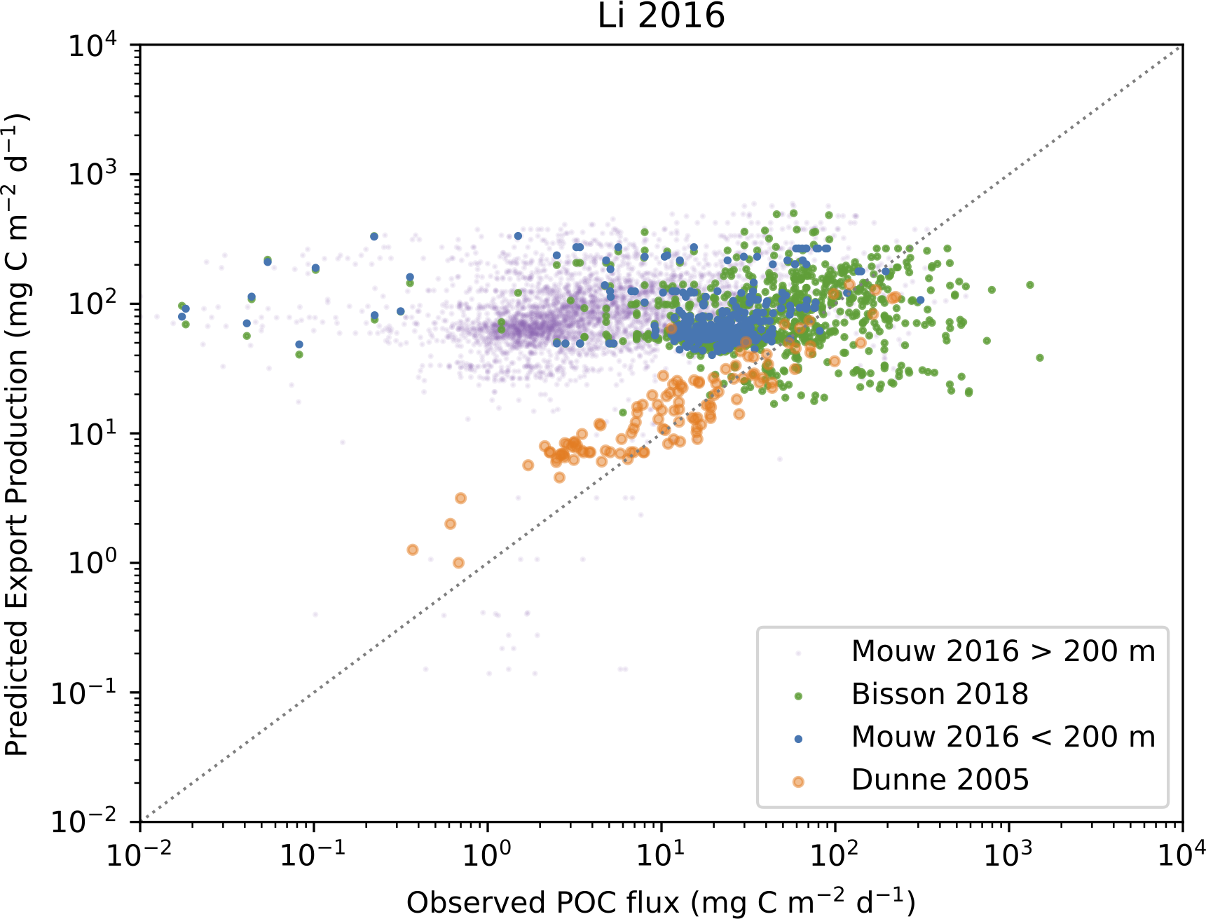 The Bisson et al. (2018) dataset is based on observations from sediment traps at depths less than 200 meters and 234Th measurements converted to POC flux at Zeu. The data is selected to represent different sampling methodologies and spatiotemporal scales, and totals 1,719 observations from 1984 to 2014.