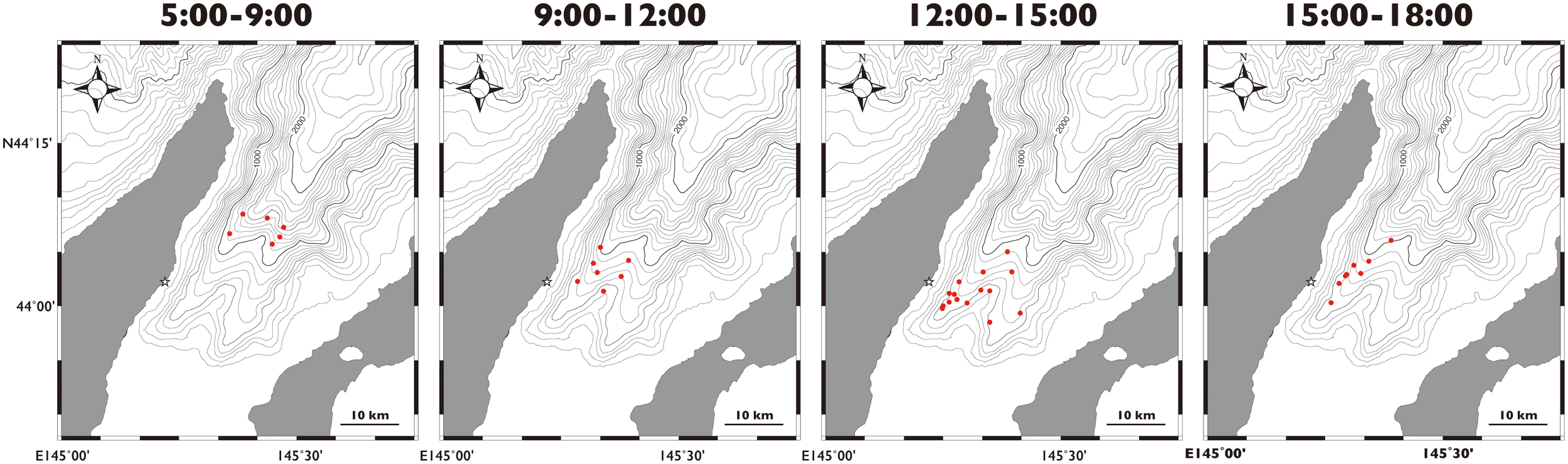 In the narrow strait, it is natural that the primary direction of movement is in the direction of the long axis of the strait, that is, in- and outward, or south- and northward in Nemuro Strait. The 500–2000 m depth area utilized by the sperm whales is approximately 30 km along the long axis of this strait. As the daytime dive depths of the whales were shallower than 500 m, the north-south distance of the area where whales utilize during the daytime is approximately 30 km. The usual horizontal displacement of foraging sperm whales is approximately 4 km/h (Whitehead, 2003), which agrees with the current GPS logger data. Thus, it takes whales approximately 7.5 h to travel through the foraging range if they move straight along the long axis of the strait. The daytime period in the research area in August is about 15 h, and whales could make one round trip during the daytime in the foraging area. At night, the dive depths were deeper than 500 m, and thus, the travel distance would be shorter than that during the daytime, and whales could make another round trip during the nighttime. This movement pattern is thought to be a foraging tactics that enables whales to explore two different layers efficiently within a day.