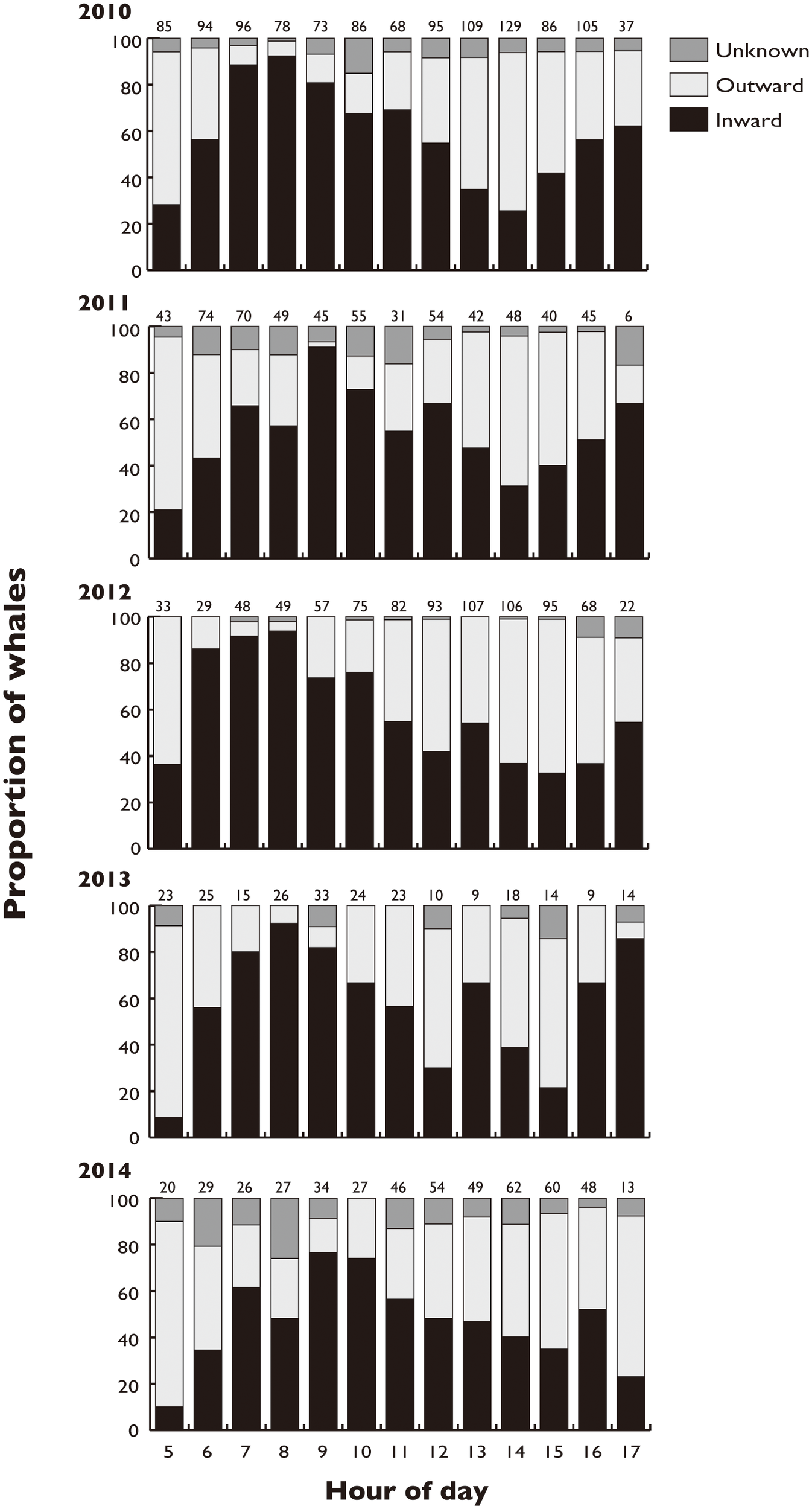 Proportion of sperm whales moving inward and outward Nemuro Strait, Japan in each hour of the day. The data were obtained by the theodolite survey, and those within the same year were combined. Numbers above the bar indicate the number of observed whales in the hour of the day.