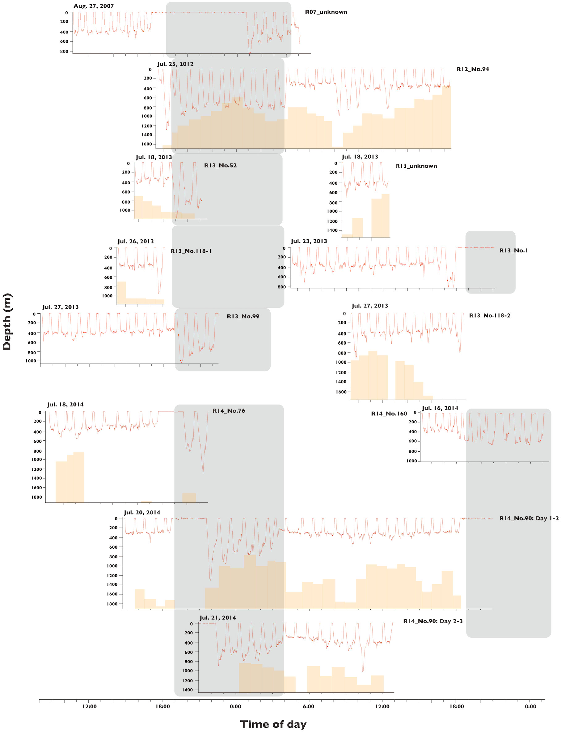 Dive depth profiles of all tagged sperm whales in Nemuro Strait, Japan. Dark shades indicate nighttime, brown bar is bottom depth of the locations of whales before the dive obtained by Fastloc GPS and the ‘500 m gridded bathymetry data’ provided by the Japan Oceanographic Data Center. Position data were unavailable for hours without brown bars.