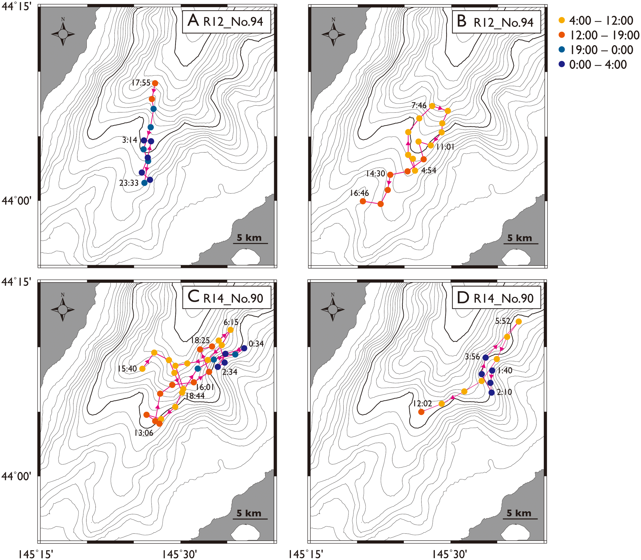 GPS tracks of two tagged sperm whales longer than 24 hours in the Nemuro Strait, Japan. Track from whale ID R12_No.94 and that from ID R14_No.90 is divided into two panels, (A, B) and (C, D) respectively, to avoid complexity.
