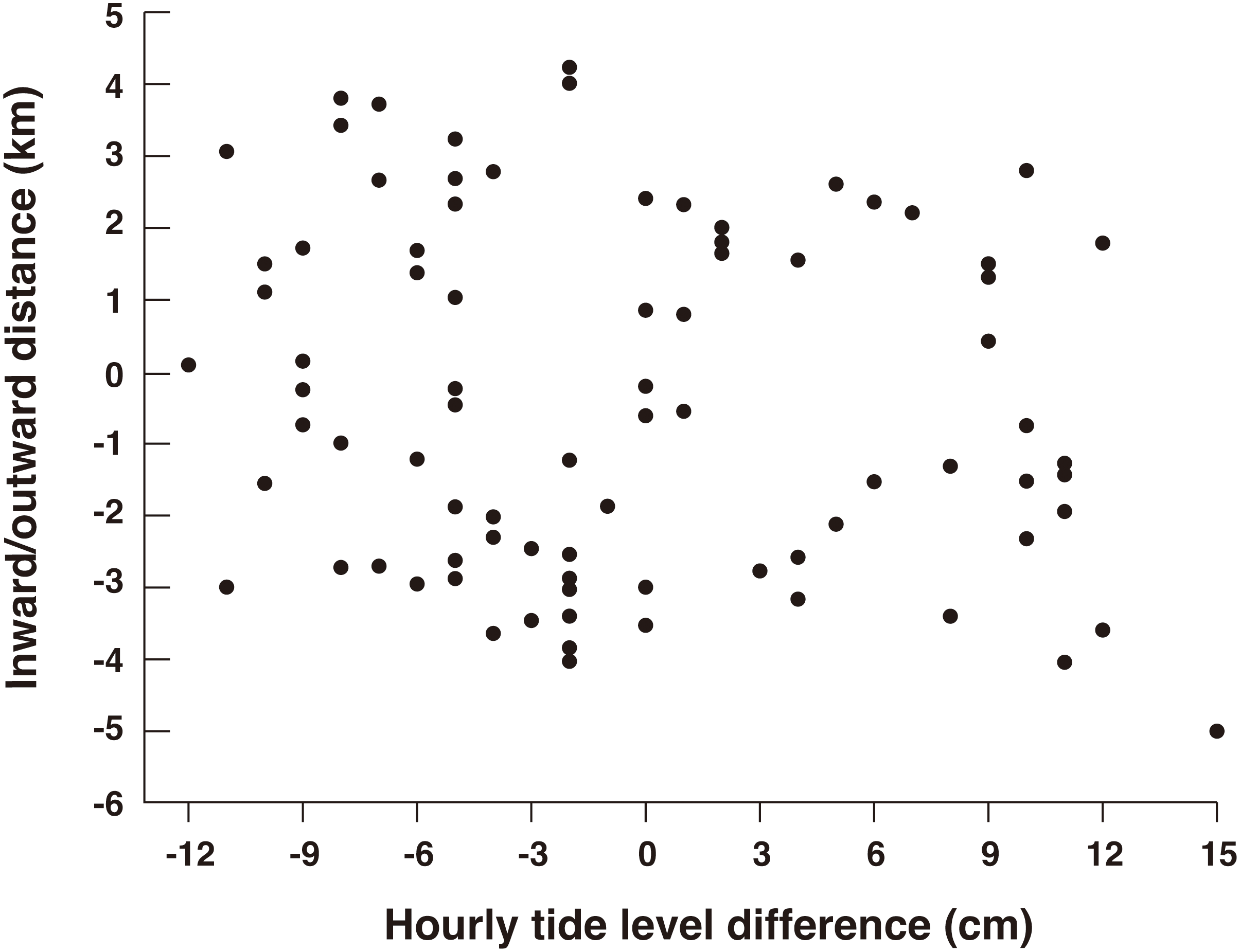 where θ is the hourly heading in degrees with north as 0°, d is the hourly distance in km, and t is time span in hours between the time when the last GPS location was obtained in each hour. As the direction of the axis of Nemuro Strait is approximately 30° from the north, we subtracted 30° in the formula, and thus positive value indicates outward movement. We did not calculate the movement distances if GPS location was not obtained or a long surface time was included within a certain hour, which happened in 23 of 105 total hours of GPS deployment. To examine whether the tidal current influenced the inward-outward distance, we used the tide height change in each hour of the day as an index of the strength of the tidal current. The effect of the tidal current index (explanatory variable) on the inward-outward movement distance (dependent variable) was examined using the GLMM with each individual as a random factor with Gaussian error structure and identity link function.