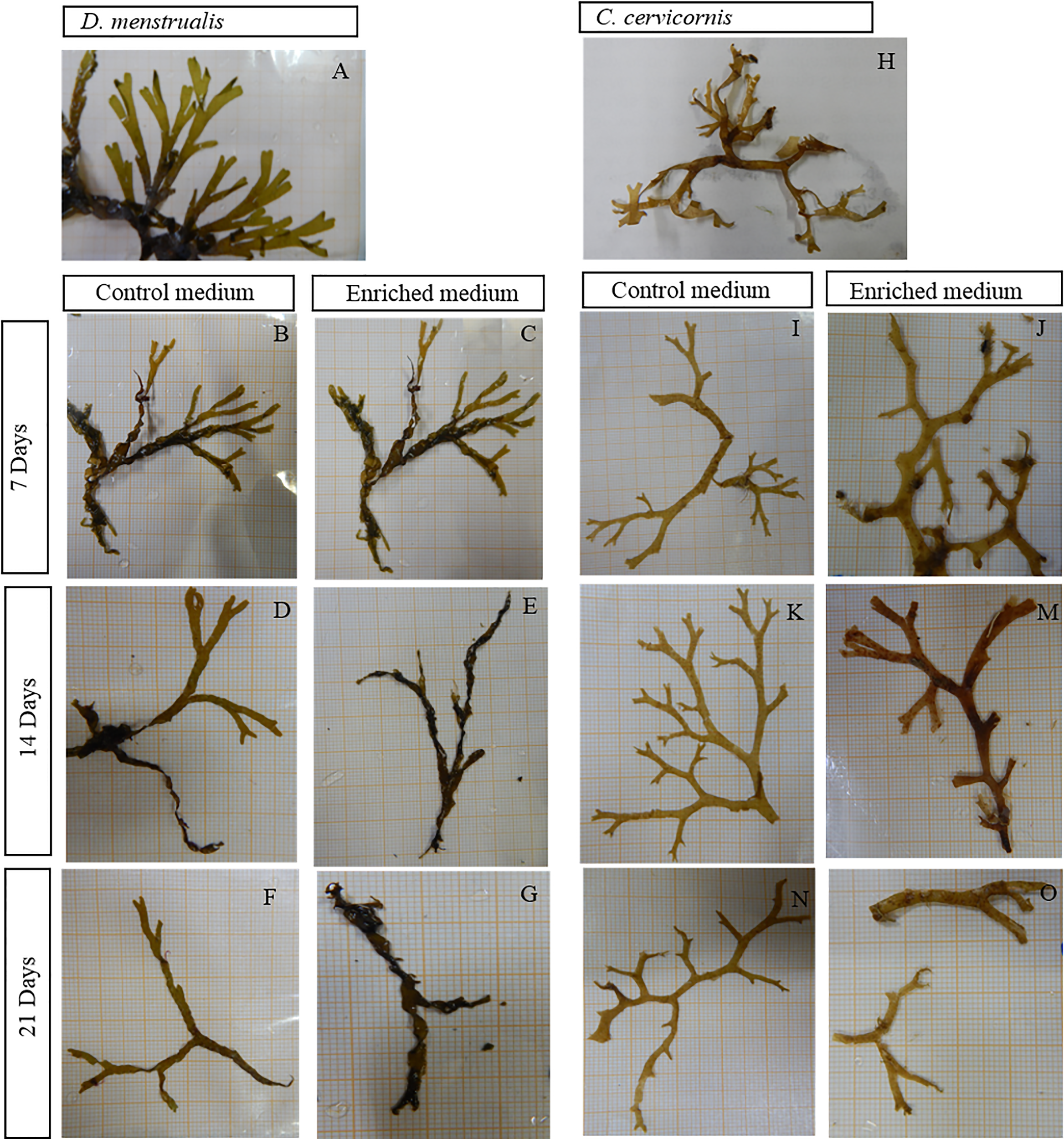 Photographic images were taken of some individuals within the 21 days of cultivation to monitor conditions and morphological changes (Figure 1). In the field, individuals of D. menstrualis showed very thin thalli with abnormal tips and margins and had a slimy texture, which was also reflected in the morphology of individuals in the experimental units, because the individuals monitored in vitro continued to present such characteristics, a result of their health condition in the natural environment and accentuated in the process of adaptation to the system (Figures 1F, G). In C. cervicornis, on the other hand, the observed individuals had healthier characteristics, such as greater stiffness of fronds, preserved and homogeneous color, and low production of mucilage (Figures 1H, O).