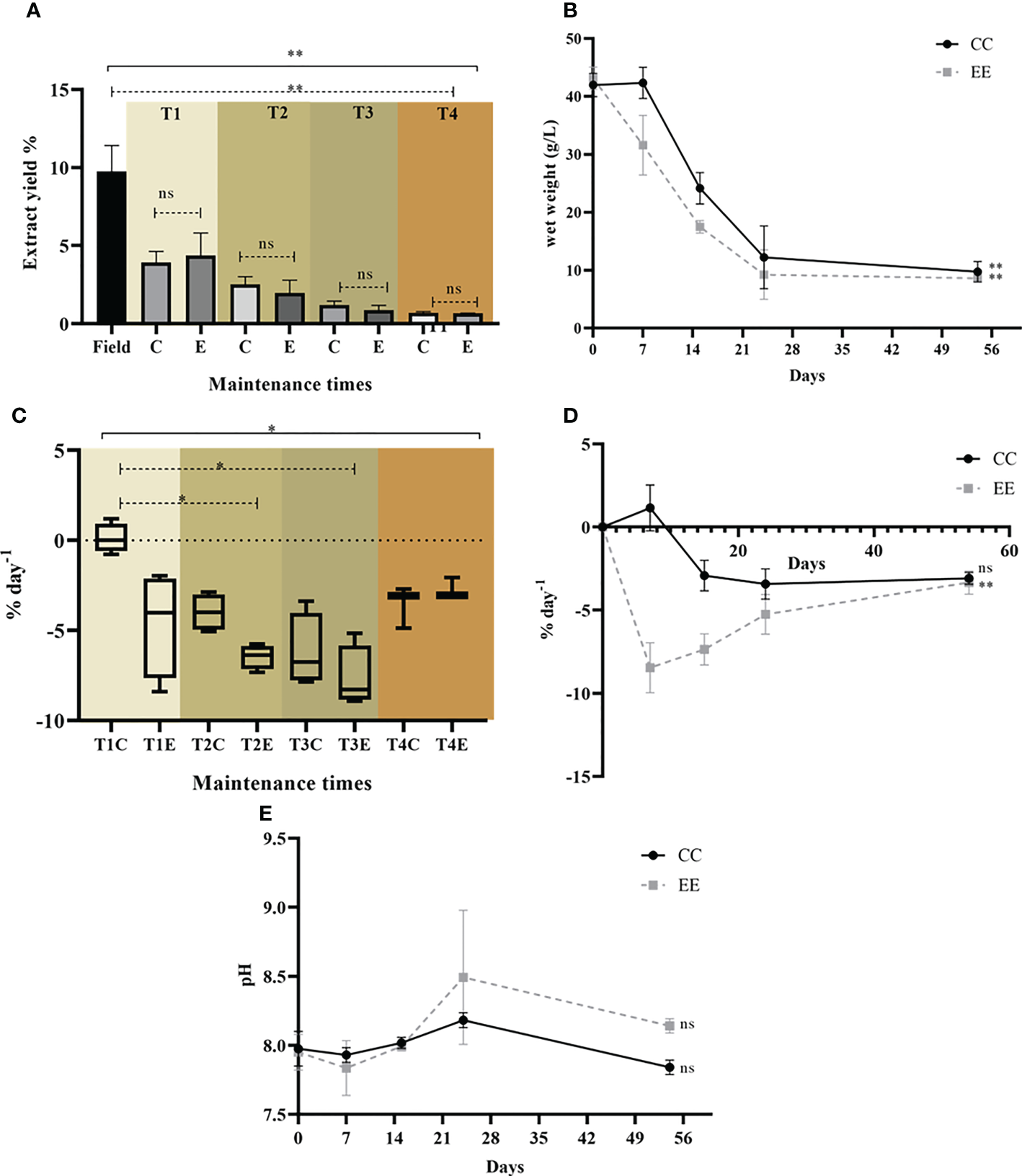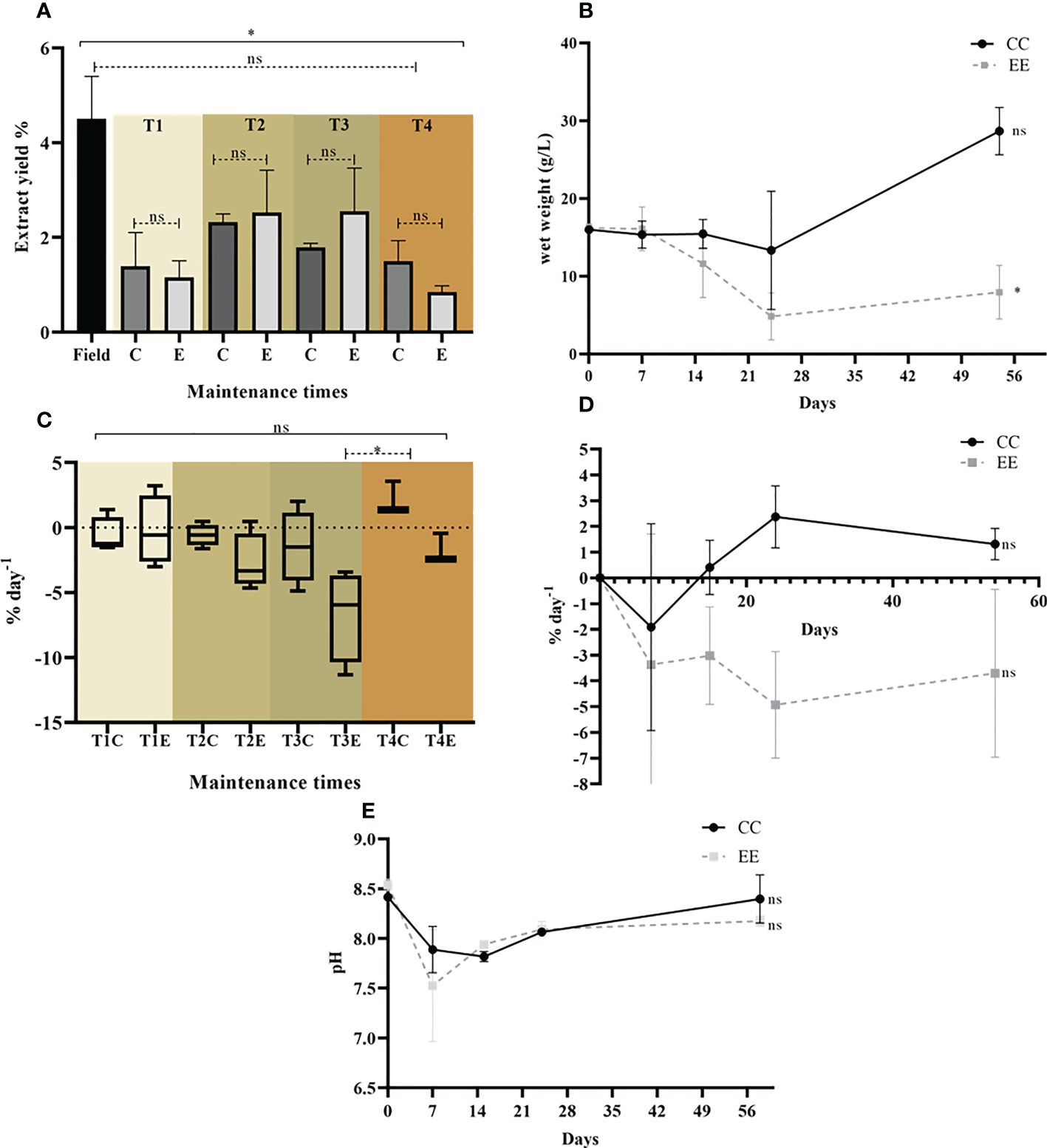Dictyota menstrualis maintenance response variables under controlled laboratory conditions for both treatments CC and EE in the defined times. (A) Comparison yield of dichloromethane extracts; (B) Biomass in wet weight (g/L) in the 4 defined time periods; (C) SGR (% day -1) at defined time points; (D) SGR (% day -1) in the control unit (CU); (E) pH monitoring at defined time points. Solid line: Kruskal-Wallis test and dashed line: Mann Whitney test. *p < 0.05; **p < 0.005, ns: not significant. All bars represent mean standard deviation (+/- SD, n=4).