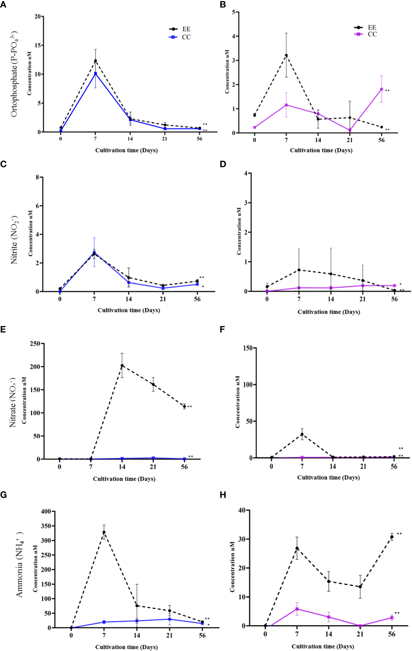 In C. cervicornis, the concentrations of dissolved nutrients did not show higher values than 35 μmol. L-1 over time. The concentrations in the experiments of CC showed stability and reached their maximum only at the end of the experiment with orthophosphate 1.53μM ± 0.31, nitrite 0.21 μM ± 0.005, nitrate 1.25 μM ± 0.009, except for ammonia that the maximum was 5.83 μM ± 2.18 at 7 days. In the EE treatment, some nutrient peaks were observed with maximum values of 31.94 μM ± 9.21 for nitrate and 26.86 μM ± 3.86 for ammonia at 7 days of culture (Figures 4B, H).