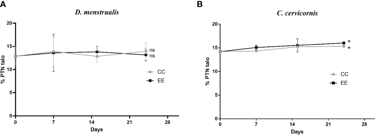 For the D. menstrualis orthophosphate, it is noteworthy that compared to time 0 (field), there was an increase in concentration for all time points evaluated in culture, with the highest concentrations (μM) at 7 days being 10.09 ± 0.04 and 12.33± 1.97 for CC and EE, respectively (Figure 4A). For nitrite, maximum concentrations after 7 days were observed for both EE and CC, namely 2.65 ± 0.32 and 2.74 ± 0.09, respectively (Figure 4B). For the nitrate, it was found that the treatment with Provasoli/2 (EE) medium showed high concentration values from the 14th day of the experiment, with a maximum value of 202.5 ± 26.32 after 7 days of cultivation. For the CC treatment, concentrations remained stable, with a maximum of 2.76 ± 0.24 after 7 days of cultivation (Figure 4C). For ammonia in the EE treatment, a maximum value of 345.8 ± 29.54 and for CC of 29.44 ± 19.48 after 7 days was recorded (Figure 4D).