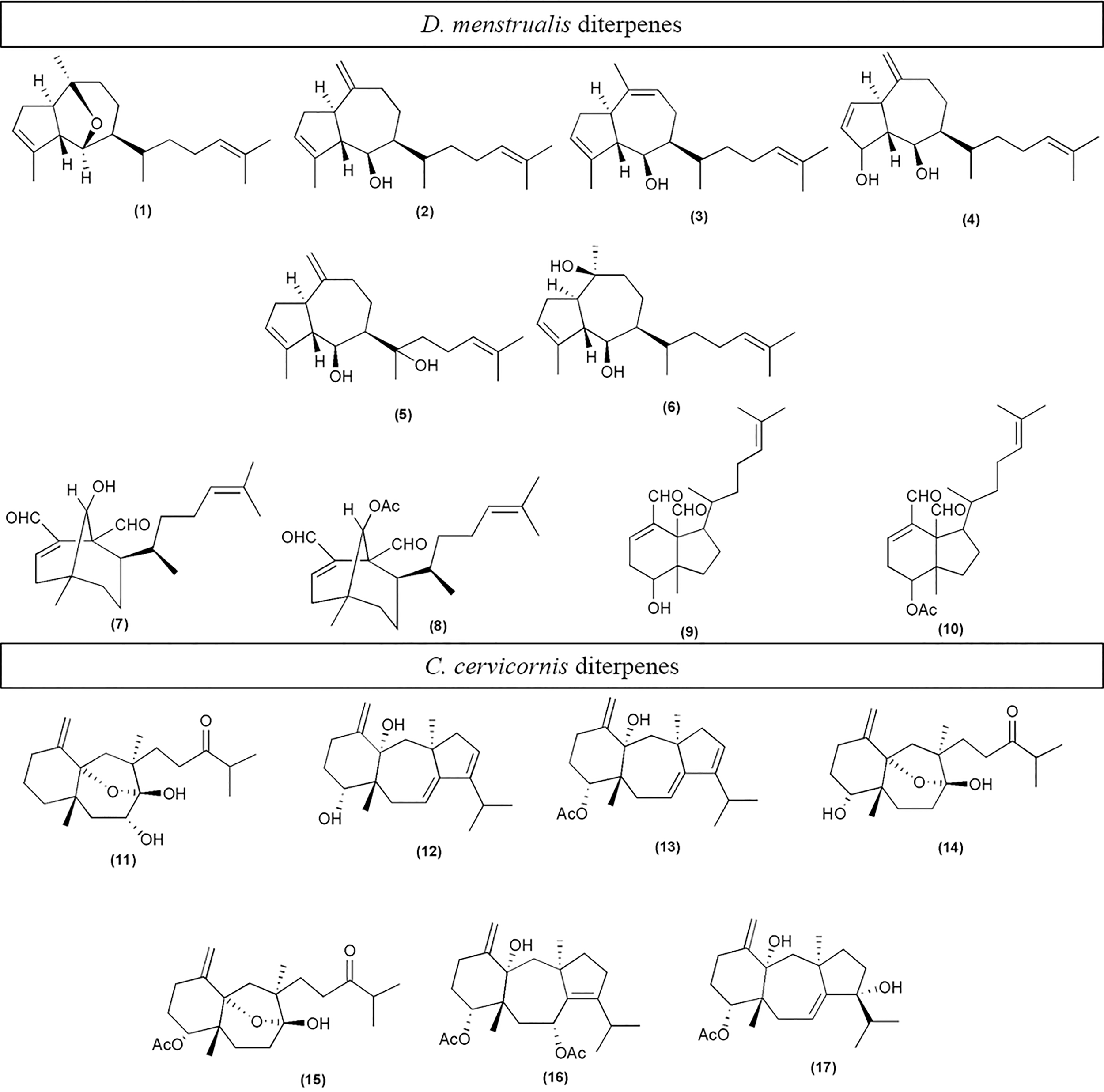 Marine natural products are the subject of much study and scientific interest due to their diversity and chemical complexity, as well as their potential biological activities. Brown algae (Phaeophyta) of the Dictyotaceae family are characterized by the fact that they produce a variety of new metabolites, especially terpenoid compounds, that are useful because of their bioactive capabilities. There is particular interest in several species of this family, being notable Dictyota menstrualis and Canistrocarpus cerviconis. Extracts of these algae, which are typically found in shallow waters and intertidal communities in subtropical and tropical areas (Sadeghi et al., 2019), exhibit a remarkably wide range of properties (Chen et al., 2018; Bogaert et al., 2020), effects of the following types: antiviral (Pereira et al., 2004; Abrantes et al., 2010; Vallim et al., 2010; Cavalcanti et al., 2011; de Souza Barros et al., 2016; Cirne-Santos et al., 2019; Cirne-Santos et al., 2020a; Cirne-Santos et al., 2020b; Ribeiro et al., 2021), cytotoxic (Jongaramruong and Kongkam, 2007; Caamal-Fuentes et al., 2014), antibacterial (Viano et al., 2009; Ibraheem et al., 2017; de Figueiredo et al., 2019; Rubiano-Buitrago et al., 2019), antitumoral (Gomes et al., 2015), anti-snake venom effect (Domingos et al., 2011), anti-inflammatory (Albuquerque et al., 2013; do Nascimento Ávila et al., 2019), anticoagulant (Albuquerque et al., 2004; Camara et al., 2011; de Andrade Moura et al., 2011), antioxidant (Rodrigues et al., 2020), and antileishmanial (Dos Santos et al., 2011). Thus, D. menstrualis and C. cervicornis were selected as the target of the present study because they are species with widely demonstrated different bioactivities and pharmacological potential. Moreover, they are species that produce group I and III diterpenes according to hypothetical biogenetic pathway for ‘‘Dictyota’’ diterpenes (Teixeira and Kelecom, 1988), thus covering the study of different types of diterpene skeletons.