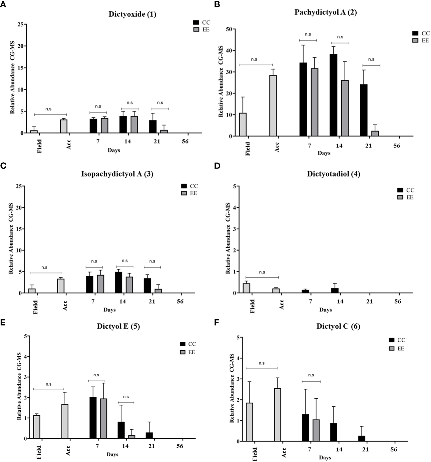 Analysis of GC-MS chromatograms of the chemical profile of Dictyota menstrualis. Comparison of the relative abundance of major diterpenes of the prenylated guaiane type across time and between treatments. (A) Dictyoxide, (B) Pachydictyol A , (C) Isopachydictyol A, (D) Dictyotadiol , (E) Dictyol E, (F) Dictyol C. Kruskal Wallis test *p<0.05; **p <0.005, ns: no significance. The bars represent the mean standard deviation (+/- SD, n=3). Acc (acclimation period).