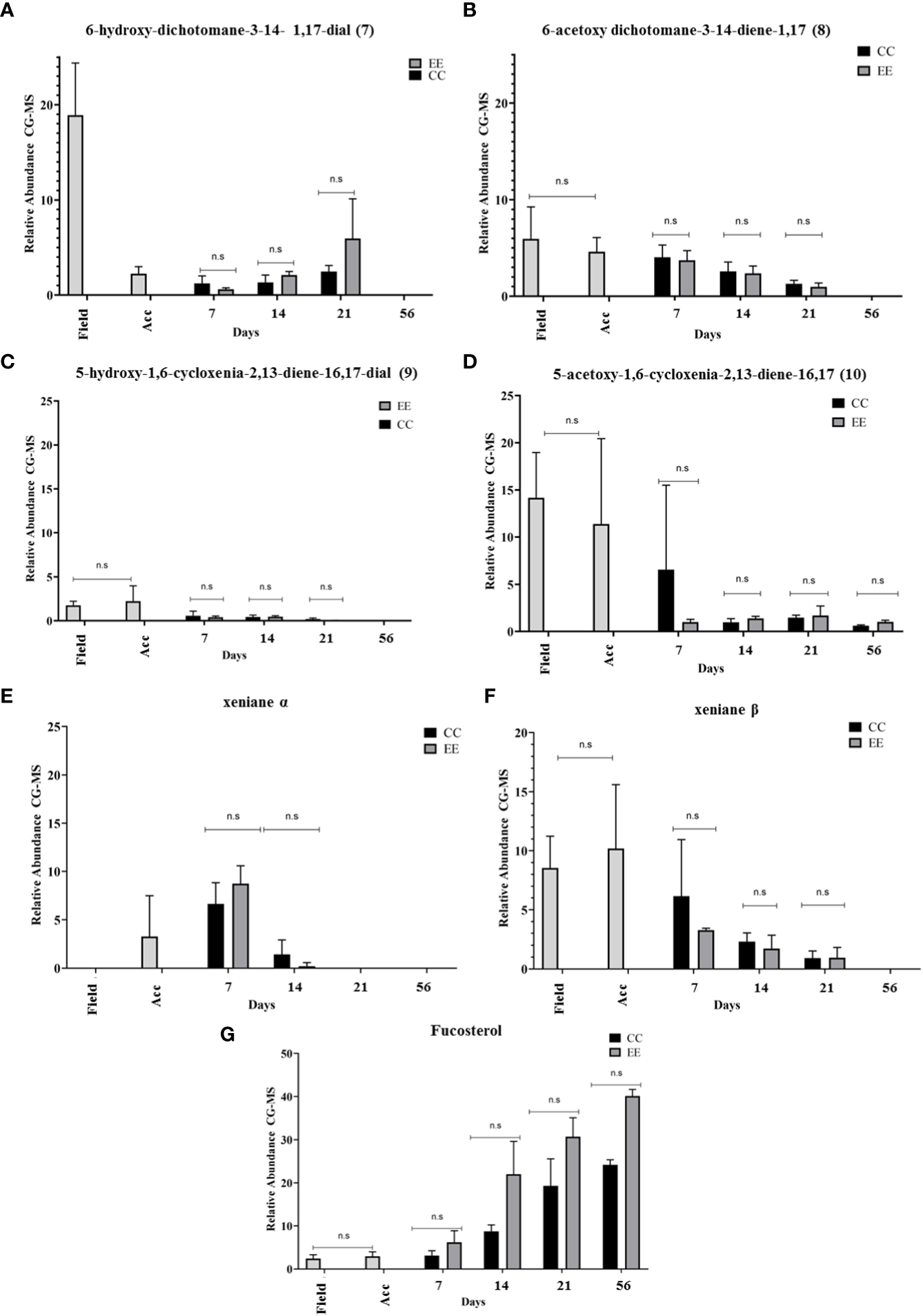 Analysis of GC-MS chromatograms of the chemical profile of Dictyota menstrualis. Comparison of the relative abundance of major xeniane-type diterpenes and fucosterol across time and between treatments. (A) 6-hydroxy-dichotomane-3-14- 1,17-dial, (B) 6-acetoxy dichotomane-3-14-diene-1,17, (C) 5-hydroxy-1,6-cycloxenia-2,13-diene-16,17-dial, (D) 5-acetoxy-1,6-cycloxenia-2,13-diene-16,17, (E) xeniane α, (F) xeniane β, (G) Fucosterol. Kruskal Wallis test *p<0.05; **p <0.005, ns: no significance. The bars represent the mean standard deviation (+/- SD, n = 3). Acc (acclimation period).