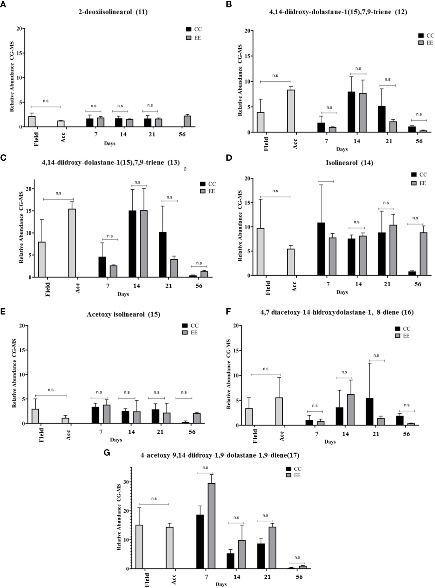 No significant differences in the relative abundances of the 7 diterpenes were observed in the 21 days set aside for the experiments. However, after including the 56-day data, diterpenes (12), (13), and (17) showed significant differences with respect to time. The data obtained from the field samples and those obtained after 7 days of acclimation did not show significant differences, but diterpenes (12), (13), and (16) show a tendency to increase their relative abundances with acclimation time (Figure 9). In particular, for diterpene (11), the highest abundance was observed in the field (2.167 ± 0.618) and after 56 days in the EE treatment (2.276 ± 0.251) (Figure 9A); for diterpene (12), the highest abundances were observed in the acclimation period (8.387 ± 0.591) and at 14 days of cultivation for EE (7.720 ± 2.543) (Figure 9B), for the diterpene (13) the highest abundances were detected in the acclimation period (15.4.70 ± 1.578), at 14 days in CC (15.078 ± 4.737) and in EE (15.155 ± 4.875) (Figure 9C). The relative abundance of diterpenes (14) was highest at 7 days in CC (10,878 ± 7,779) and at 21 days in EE (10,424 ± 2,143) (Figure 9D).