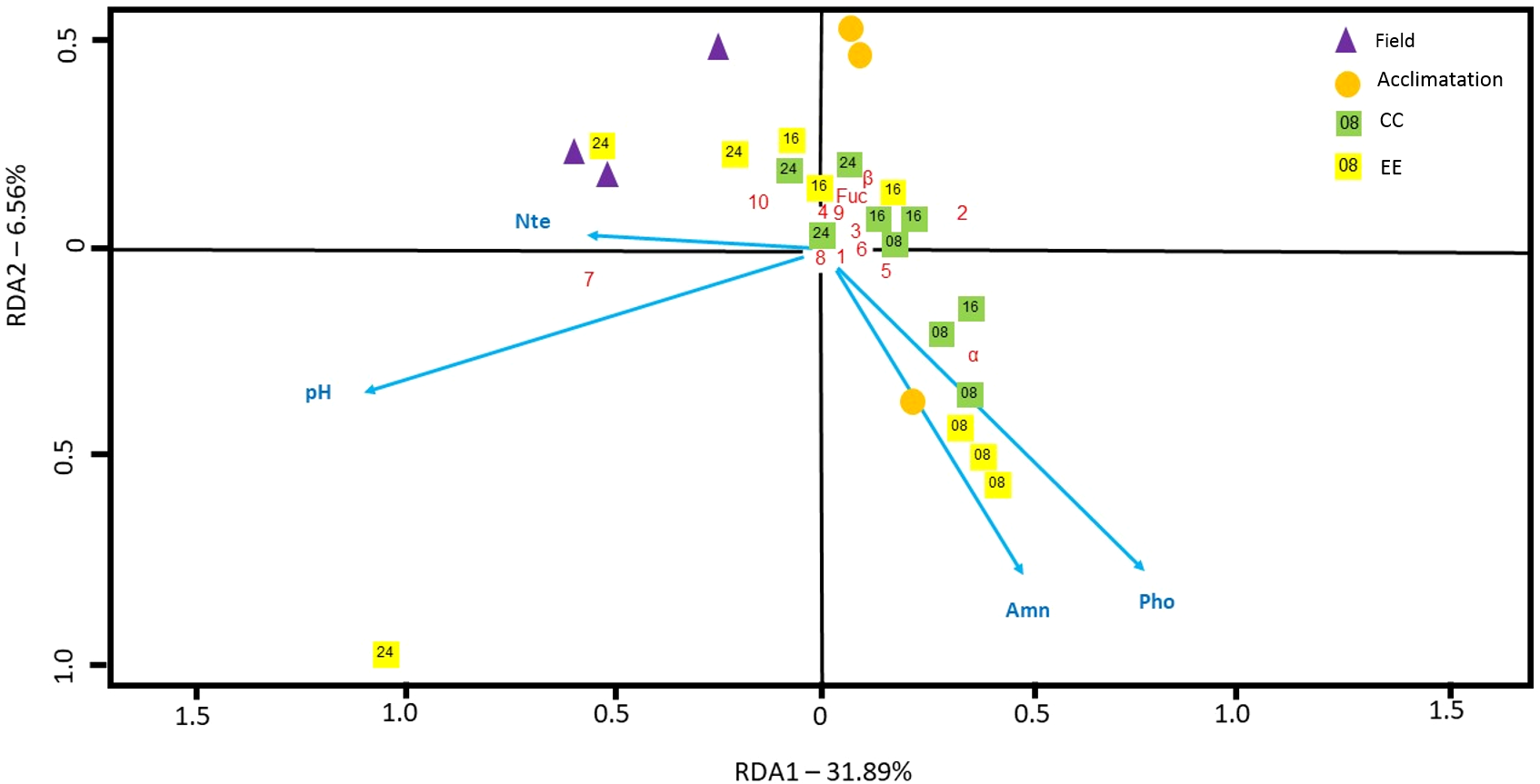 The significant redundancy analysis (RDA) for D. menstrualis explained 30.7% (adjusted R2) and 42.7% (proportion explained) of the total variation within the diterpene data, with the first axis accounting for 31.9% of the proportion explained variation (74.6% of total explained power). Along the rda1 axis, pH (-0.95) and nitrite (-0.48) presented the higher significant contributions, and three diterpene had scores above 0.20 and were considered strongly associated with this axis, the diterpene 7 (-0.56), α (0.35) and 2 (0.33). The Field samples (-0.51, -0.57, -0.25), experiment samples after 8 days (0.40, 0.36, 0.35) and 24 days (-0.23, -1.05, -0.54) presented a strong association between their diterpenes profile composition and the rda1 axis. The redundancy analysis (RDA) for C. cervicornis wasn´t statistically significant (Figure 10).
