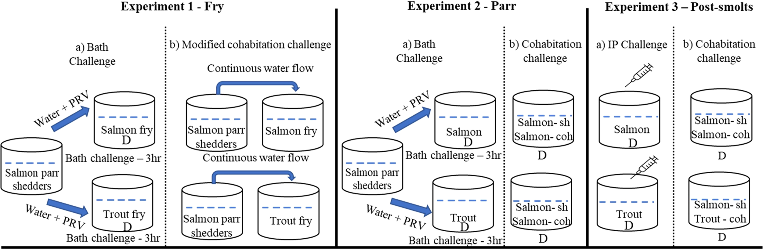 Bath challenge: On the day of challenge, the water flow in the shedder fish tank was stopped for 3 hours. The water was aerated and oxygen levels in the water were monitored to ensure fish welfare. Then, 30 L of water from the shedder tank was transferred into each of four smaller basins. 140 trout were then added into the first two basins (70 fish per basin), and 140 salmon were added into the remaining two (also 70 fish per basin). The fish were exposed to PRV-1-containing water for 3 hours. The water was aerated during the bath challenge and the oxygen levels in the water were monitored. Following exposure, the fish were transferred into four 250 L tanks (stocking density – 2 kg m-3) for the remainder of the experimental period.