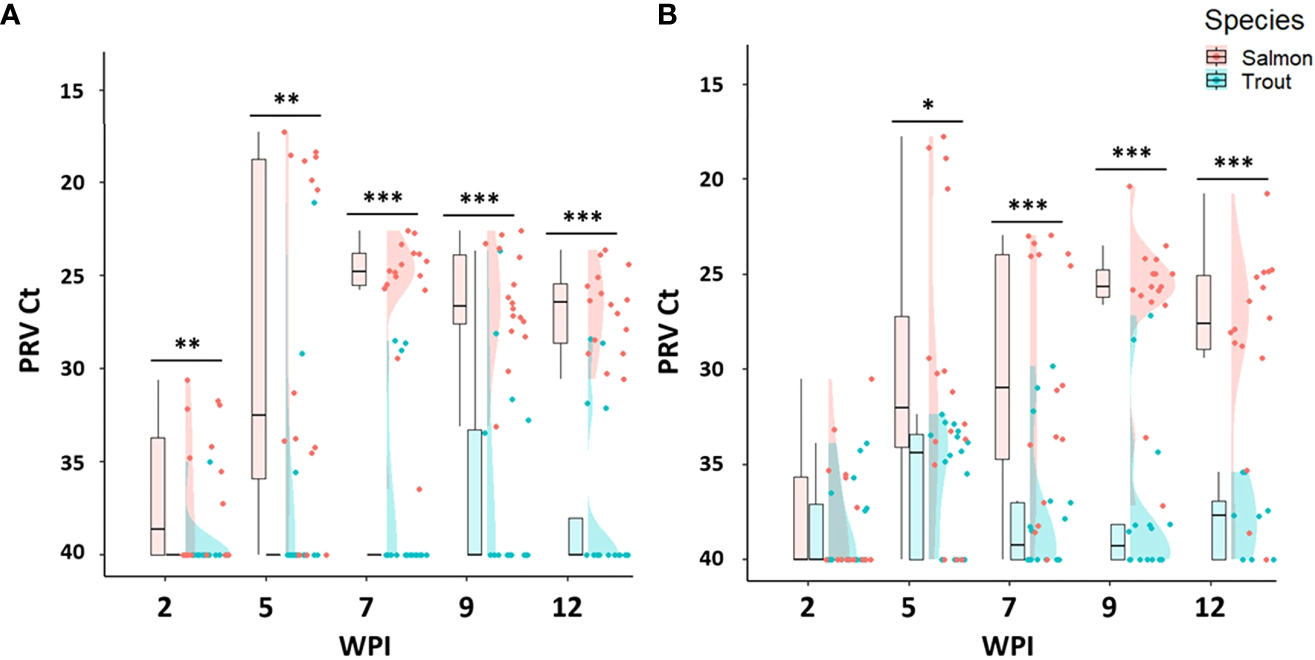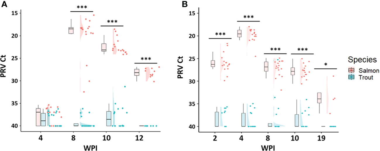 The data arrangement, visualization, and statistical analyses were performed in R (R core team, 2013). The mean ± standard deviation (SD) of qPCR Ct value from positive samples were described in Tables 2–4, and statistically different infection prevalence between salmon and trout in each time point and the developmental stage was regarded as significant when the P-value was less than 0.05 by the Chi-square analysis using a “gmodels” library in R (Warnes et al., 2015). The raincloud plot was employed to present the individual Ct value with different time points, species, and challenge methods in Figures 2–4 using “cowplot”, “ggplot2”, and “tidyverse” libraries in R (Allen et al., 2019). Welch’s two-sample t-test was implemented to compare viral load (Ct value) and growth performance between Atlantic salmon and brown trout in the same challenge group at the same time point, and Tukey HSD one-way analysis of variance (ANOVA) test was carried out for qPCR Ct value from PRV positive salmon or trout among the different sampling time point using the “haven” library (Wickham and Miller, 2017).