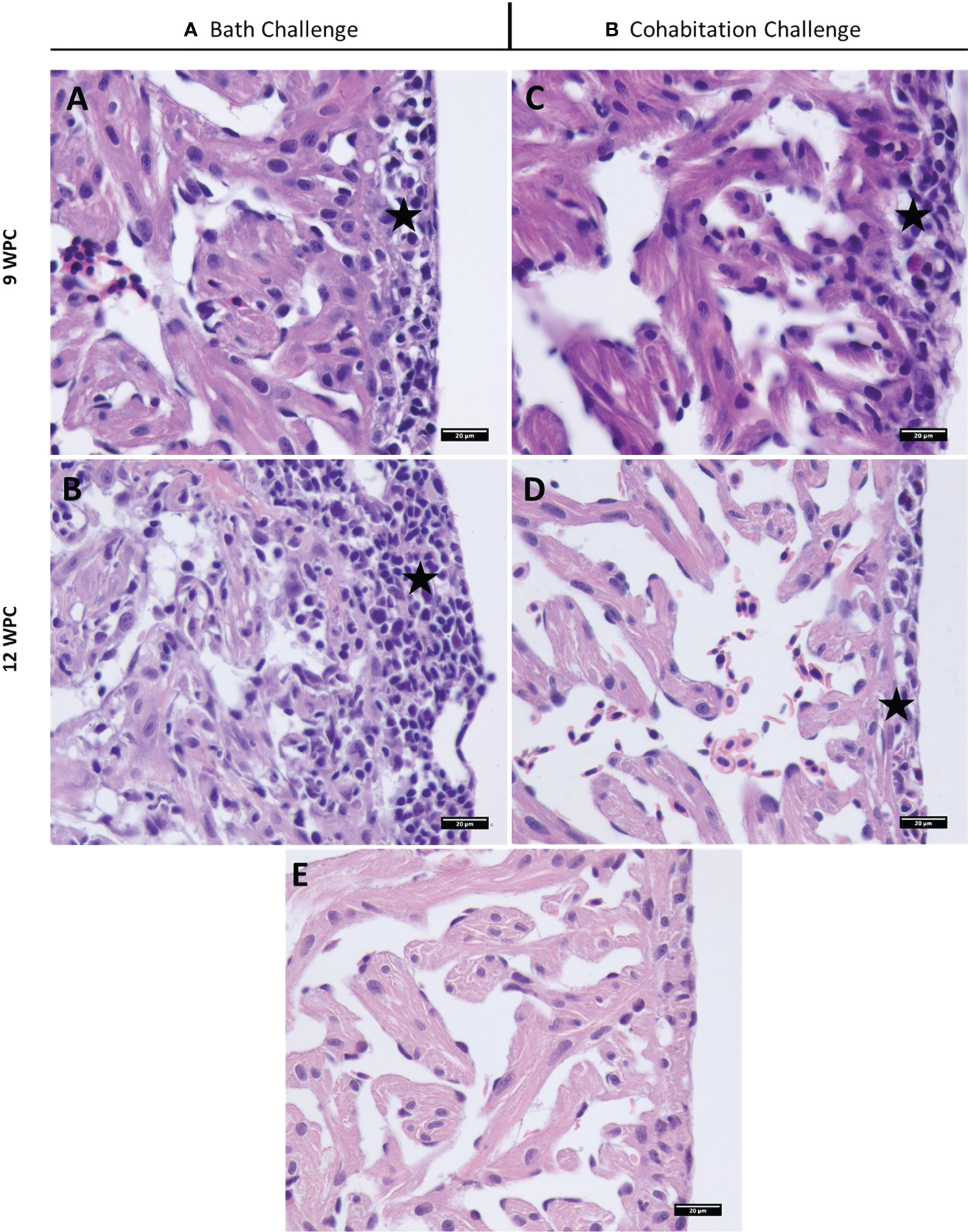 Cohabitation challenge: The experiment was set up in four tanks by transferring 30 salmon shedders (at 4 wpi) into four different 250 L experimental tanks, followed by transfer of 70 trout into two of these tanks and 70 salmon to the last two cohabitant challenge tanks. Shedder salmon were adipose fin clipped to aid identification during the sampling. Eight fish from each tank were sampled for qPCR/histology. Sampling of spleen for qPCR and heart for histopathological analyses were carried out for all groups at 0-, 2-, 5-, 7-, 9- and 12-wpi.
