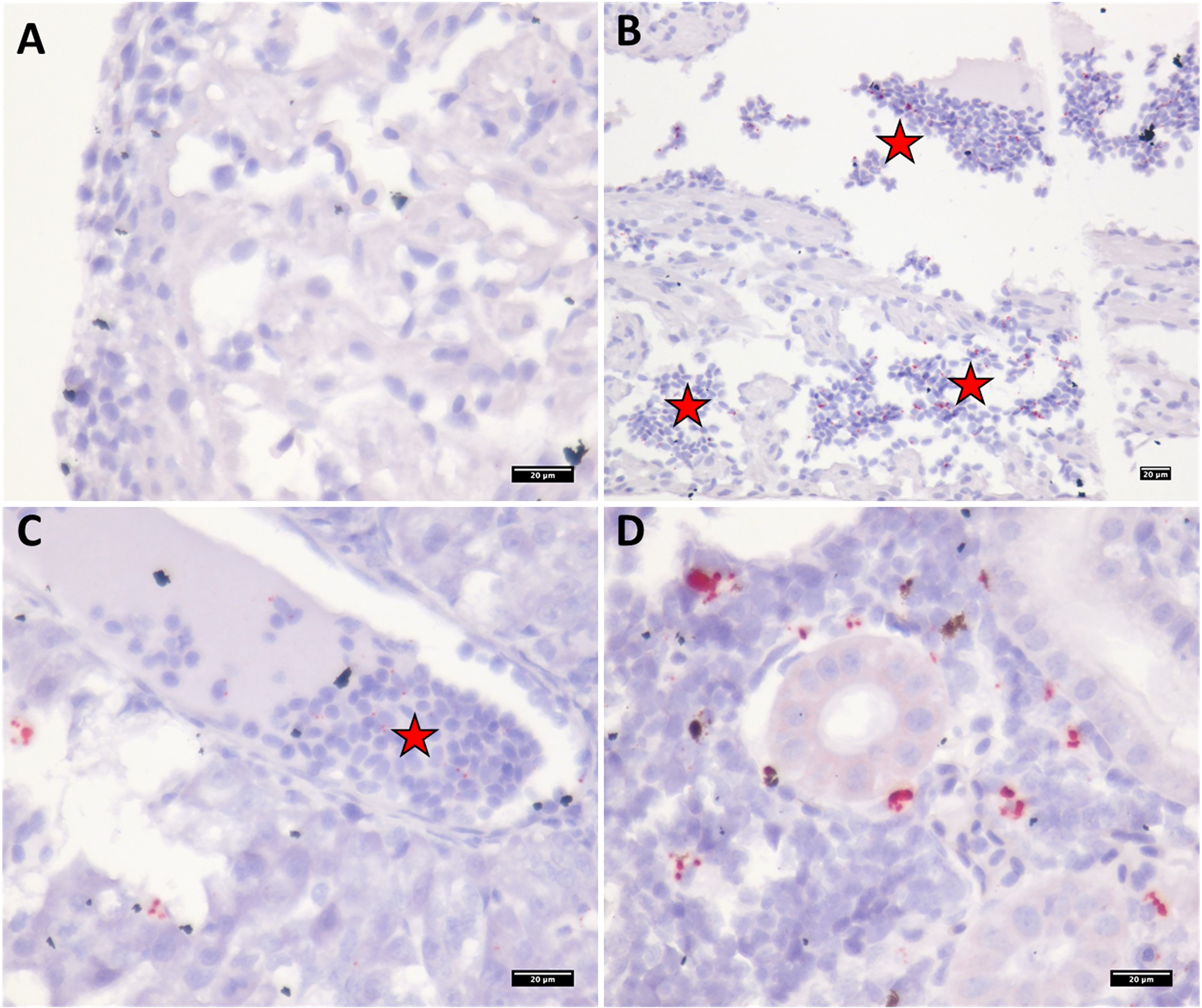 RNAscope in situ hybridization of PRV-1 using the RNAscope 2.5 HD manual detection red kit (Advanced Cell Diagnostics, Newark, CA, USA) was carried out as described previously (Dhamotharan et al., 2020). The probe targeting PRV-1 segment L3 region 415-1379 (relative to ORF start) (KY429945) (catalogue number 537451) was used for ISH. A probe targeting Salmo salar peptidylprolyl isomerase B (ppib) (PPIB) mRNA (catalogue number 494421) was used as a positive control, and a probe against the Bacillus subtilis strain SMY dihydrodipicolinate reductase (dapB) gene (catalogue number 310043) was used as negative control. Formalin fixed paraffin embedded (FFPE) sections (n=2) from salmon (7-, 9-, and 12-wpi) and trout (7- and 9-wpi) bath challenge were stained for PRV-1. In brief, the sections were baked at 60°C for 60 min and deparaffinized in two changes of xylene for 5 minutes each and two changes of absolute ethanol for 1 minute each with agitation. The slides were air-dried for 5 minutes at RT. The sections were incubated with 3% RNAscope hydrogen peroxide for 10 min at room temperature and then boiled for 15 min in RNAscope 1x target retrieval reagent at 95-99°C. The slides were rinsed with distilled water and transferred to absolute ethanol for 3 minutes, followed by drying at 60°C. A hydrophobic barrier was drawn around each section using an Immedge™ barrier pen (Vector Laboratories) and dried overnight at RT.