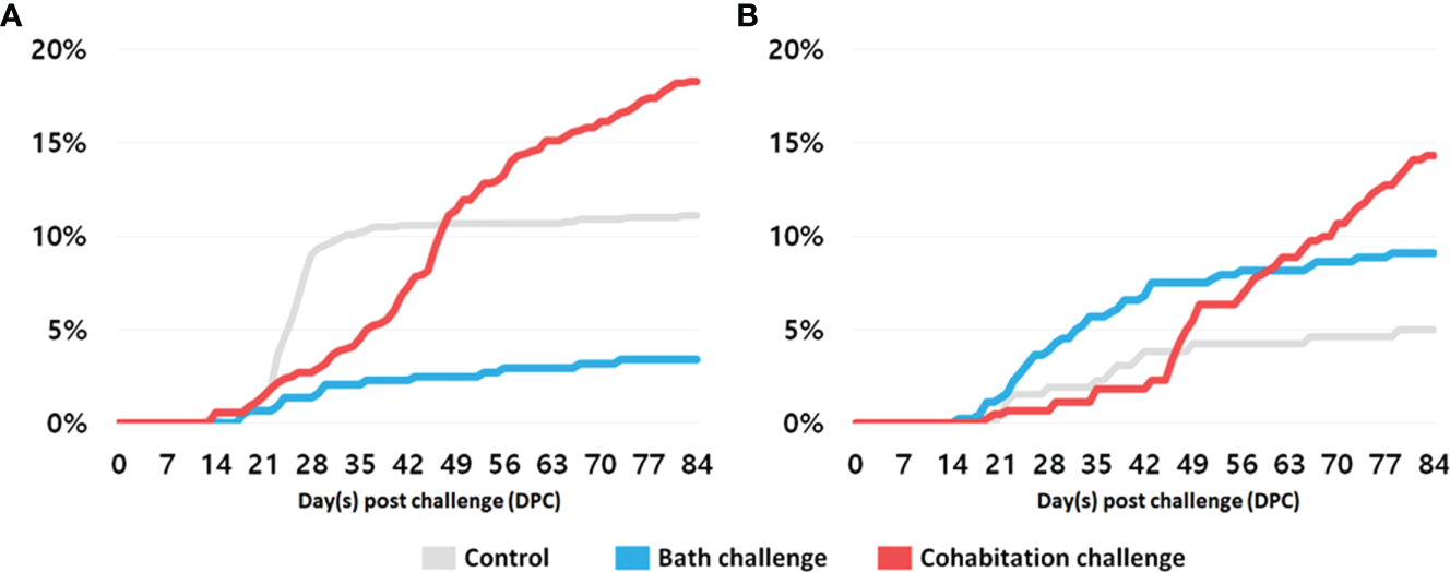Like experiment 1, the virus inoculum for both bath and cohabitation challenge originated from the salmon shedders which were i.p. injected with 50µl of the same PRV-1b infectious material as used in experiment 1, four weeks before the start of the parr challenge. PRV-1 infection in the shedders was confirmed one week prior to the parr challenge by qPCR analysis. The average Ct-value in blood and spleen of the tested shedders was 11.8 and 17.3, respectively.
