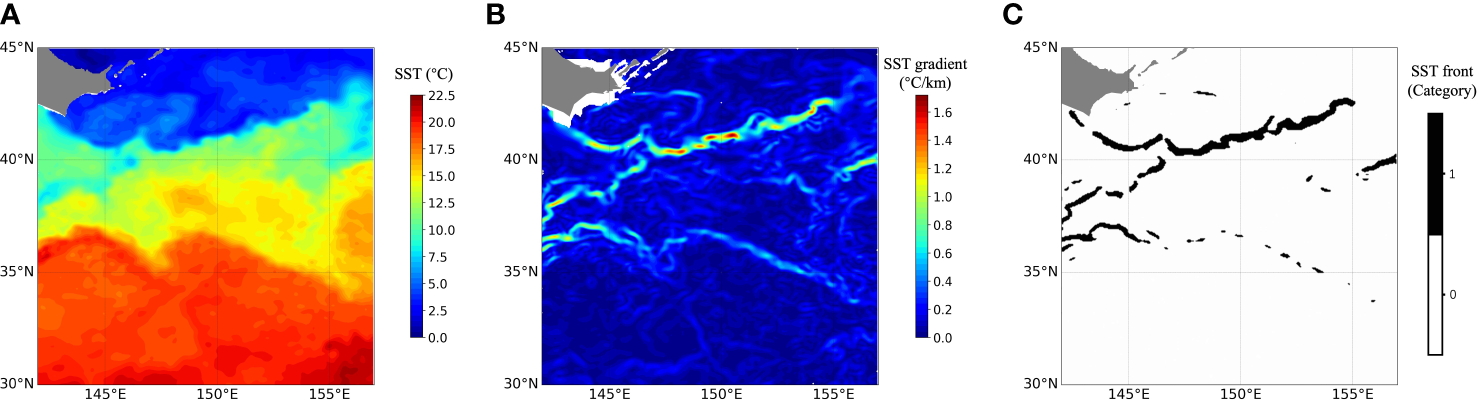 Data processing procedures in the OC region. (A) The SST data on 2 January, 2015, (B) front structures derived from physical quantities, and (C) fronts derived from threshold segmentation. The background is represented by category 0 and the SST front structure is represented by category 1.
