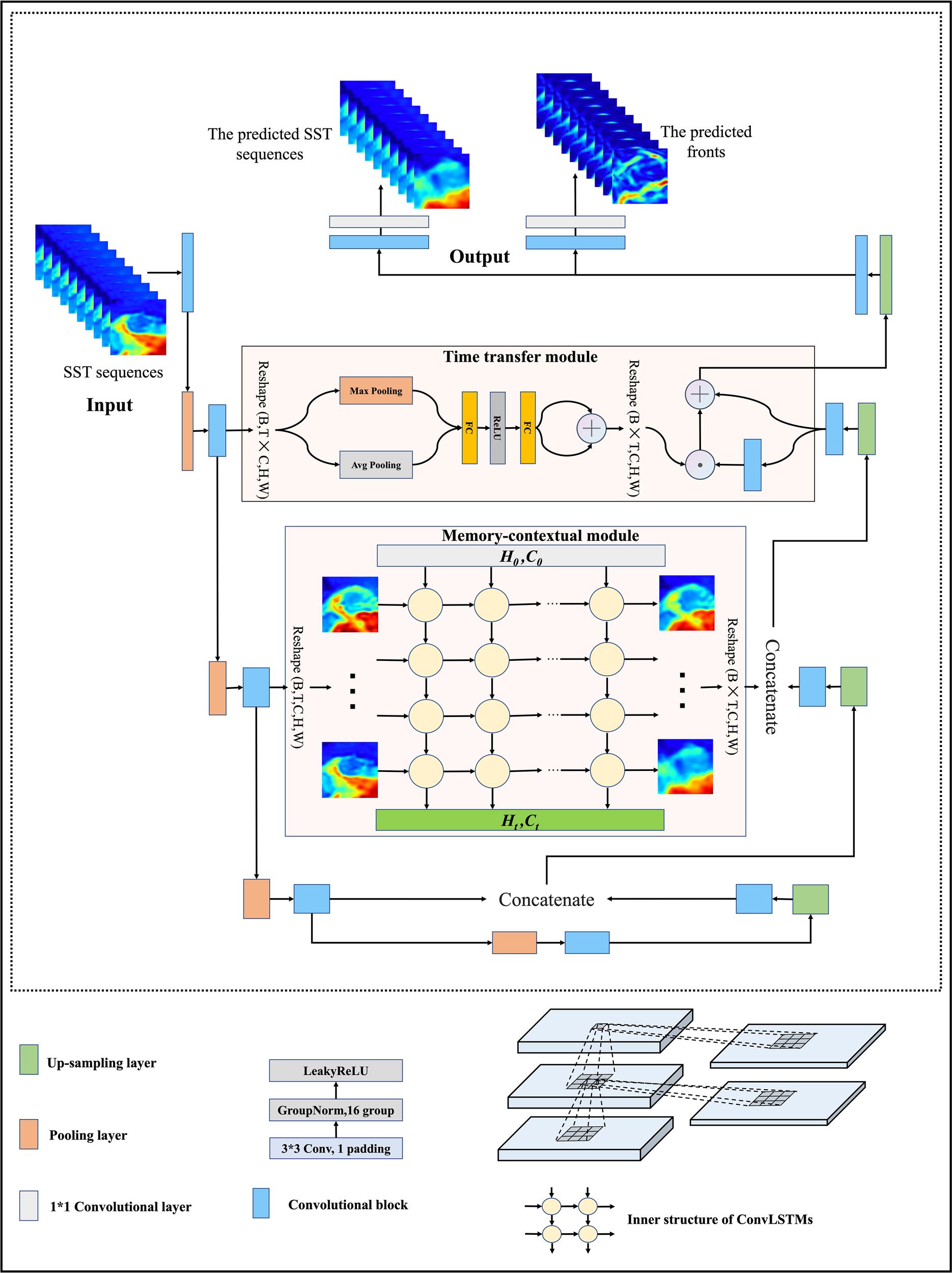 The MCSTNet framework. It includes three parts: the encoder-decoder structure, the time transfer module, and the memory-contextual module. MCSTNet receives SST sequences and then outputs the predicted SST sequences along with SST fronts.