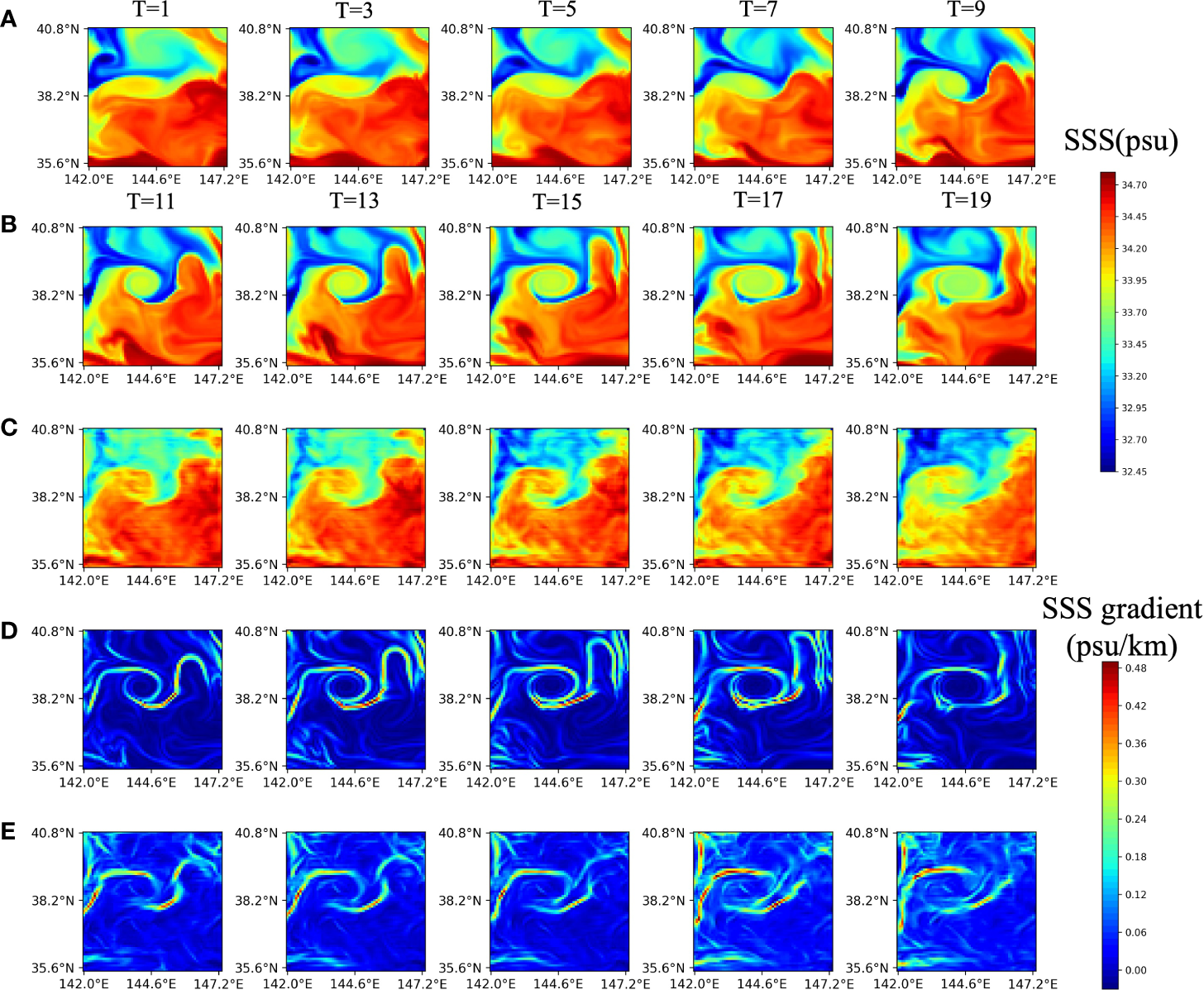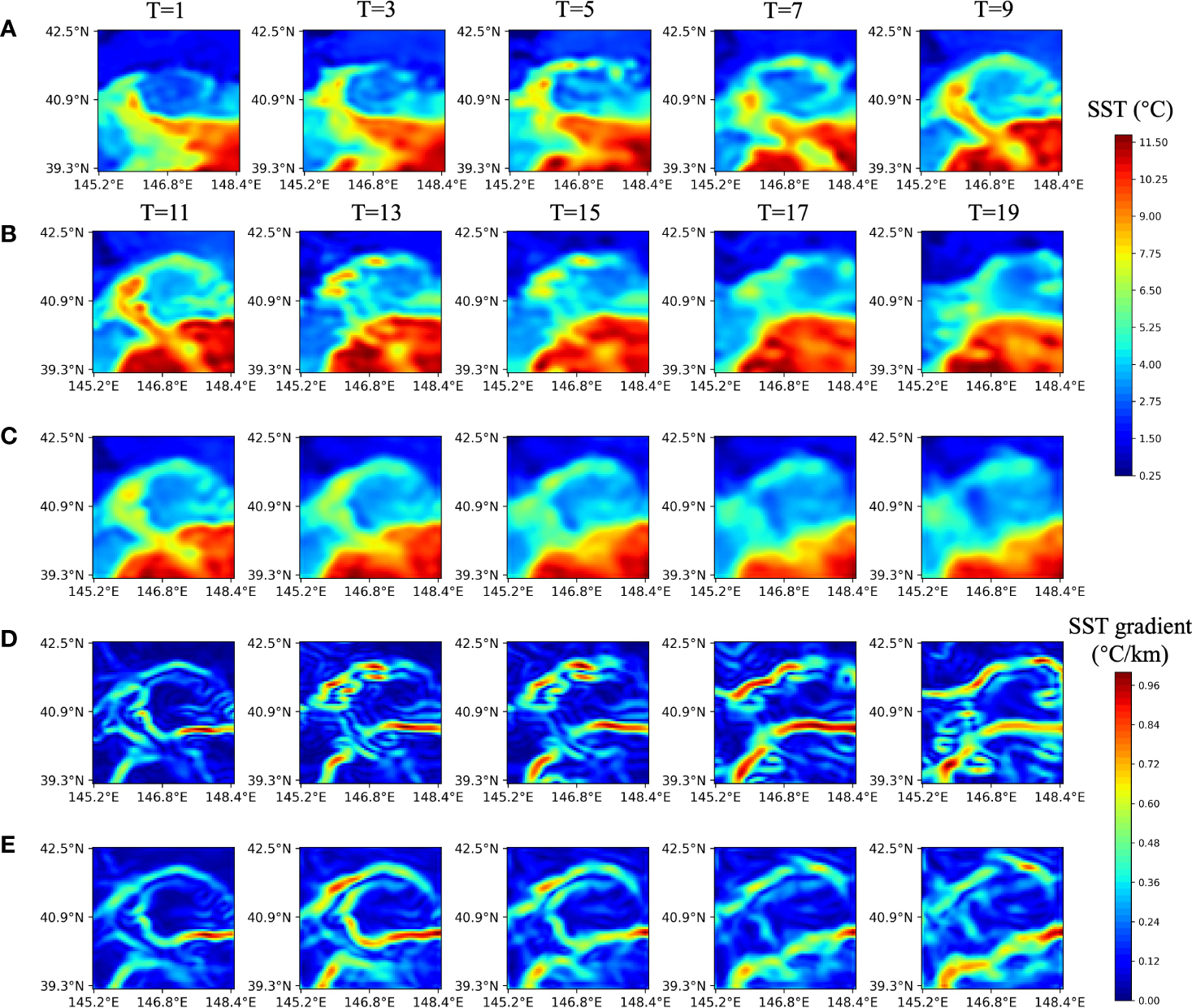 Satellite and predicted SST sequences, physics-based and predicted fronts at five successive sequences with 1-day intervals. The previous 10-day satellite SST sequences are input into MCSTNet to predict future 10-day SST sequences and fronts. (A) Input SST sequences on 6, 8, 10, 12, and 14 March, 2015. (B) Target SST, (C) the predicted SST, (D) target frons, and (E) the predicted fronts, on 16, 18, 20, 22, and 24 March, 2015.