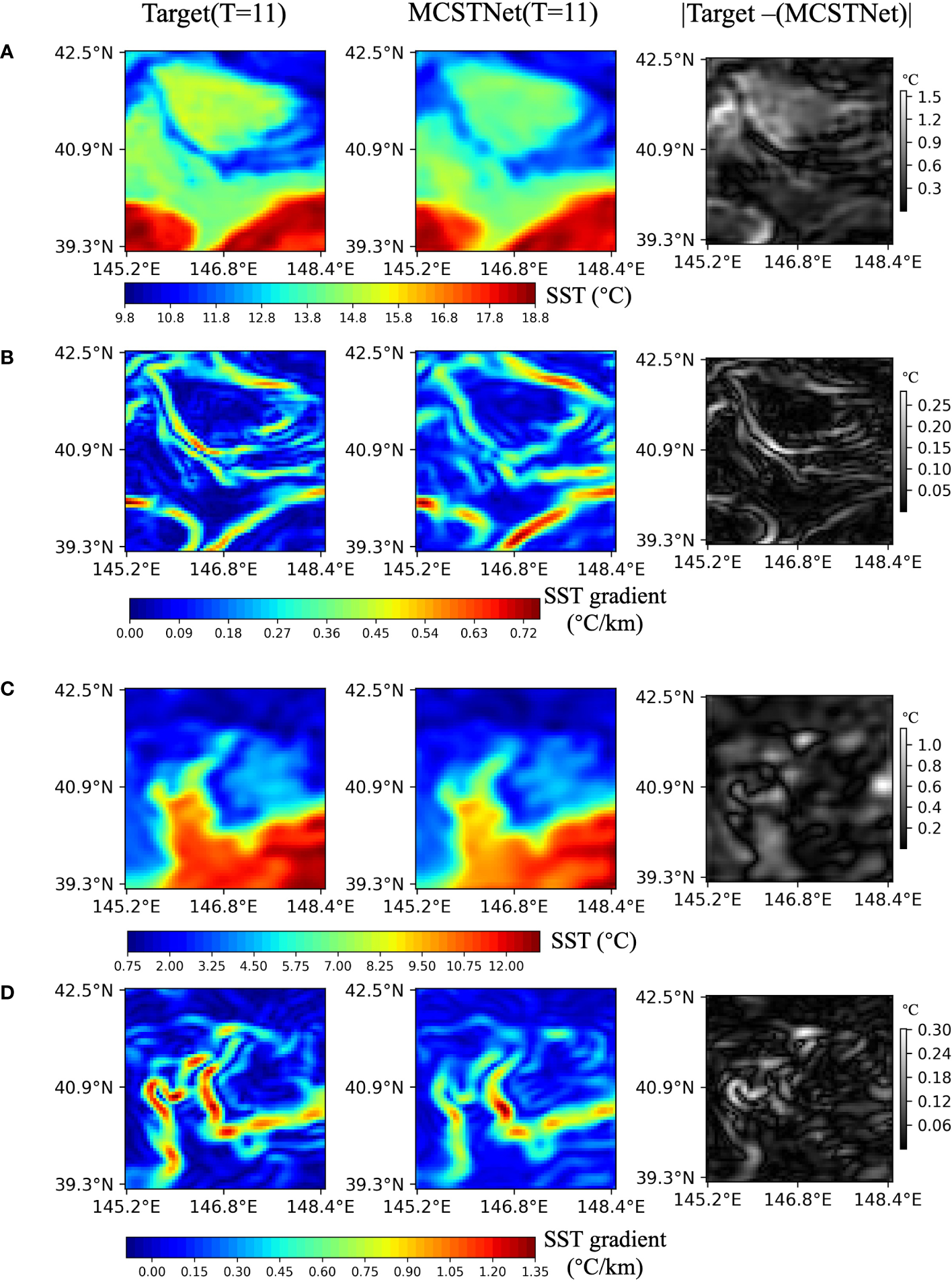 To demonstrate the advantages of the MCSTNet framework in predicting SST sequences and fronts, we compared MCSTNet to comparative approaches for both quantitative and qualitative assessments based on the SST data.