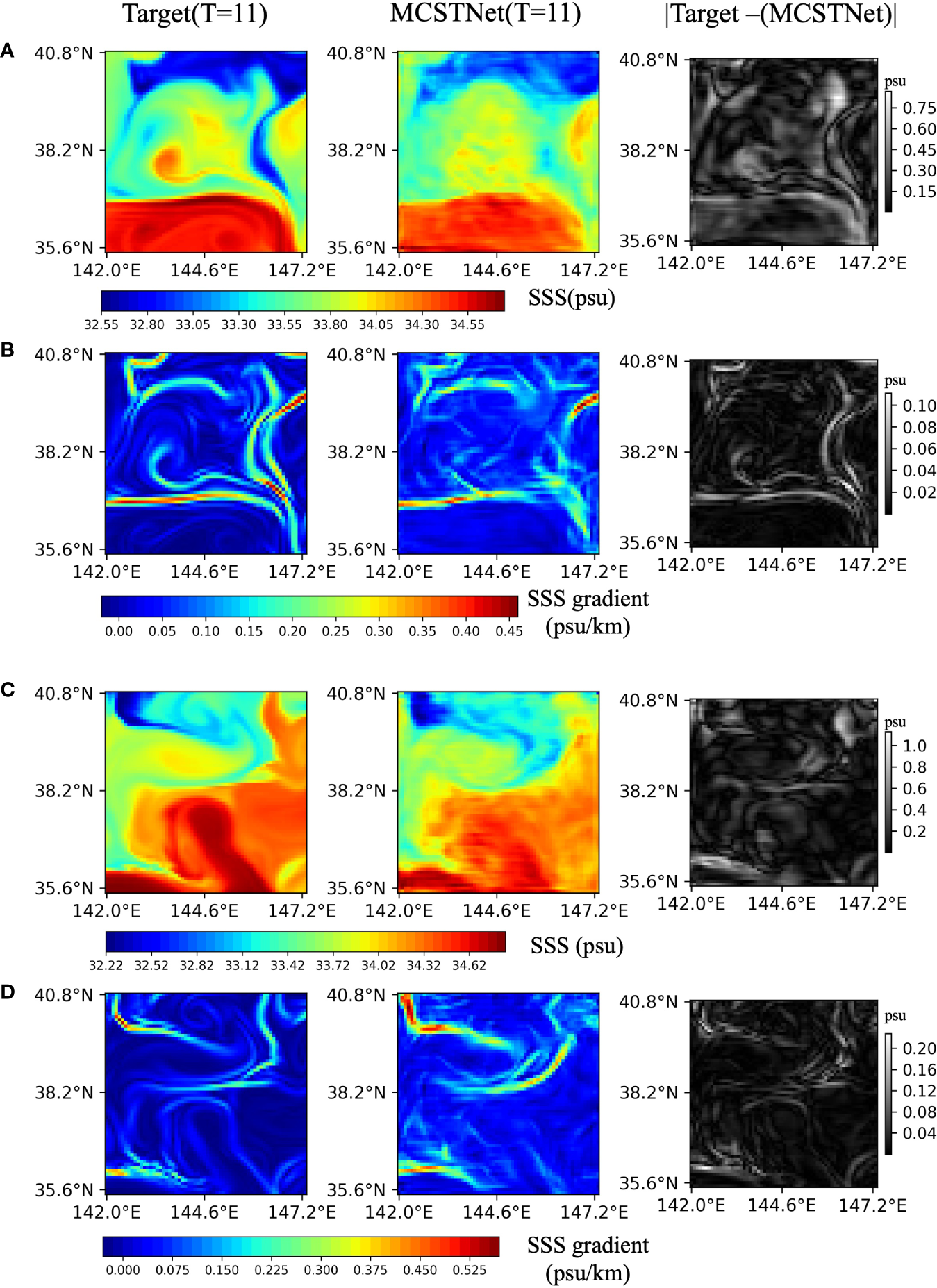 In addition, the sea surface salinity (SSS) data are applied to verify the reliability and generalizability of the proposed MCSTNet. Similar to the SST data, the 8-year SSS data are used as a training set, from 1 January, 2006, to 31 December, 2013, and the 2-year SSS data are employed as a testing set, from 1 January, 2014, to 31 December, 2015. The daily SSS data, with a spatial resolution of 0.08° × 0.08°, from ERA5 reanalyses are generated by the Operational Mercator global ocean reanalysis system. Similarly, the target front structures are obtained using physical quantities to derive gradients of SSS. Hereafter, we substitute front for front structure in subsequent text.