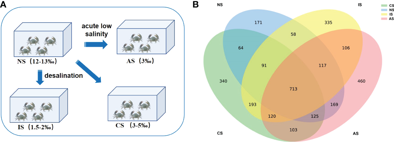 The experiment was conducted during the natural photoperiod at room temperature. And water quality parameters were measured every day. The parameters including: pH 7.8~8.6, water temperature 25°C~30°C, dissolved oxygen > 7.0 mg·L-1, nitrite concentration < 0.15 mg·L-1, ammonia nitrogen concentration < 0.8 mg·L-1 (Table S1). The crabs were fed once a day at 5:00 p.m. Depending on local conditions, low-value and fresh shellfish were selected as food sources, such as clams and river snails, which are commonly used as feed in mud crab farming due to their high nutritional value and palatability. After 90 days, five active, healthy adult crabs with uniform body weight (165 g-297 g) were randomly selected from NS, CS and IS group in October 2020, respectively. Then 30 crabs from NS group were randomly selected and fed in seawater diluted to 3‰ for one week (three replicates), and defined as AS (acute low salinity) group, under the same feeding conditions as above. At the end of the culture, crabs were killed after being anesthetized in ice water, and then the intestine and its contents were quickly taken out and stored in liquid nitrogen for 16S rRNA gene sequencing (n=5).