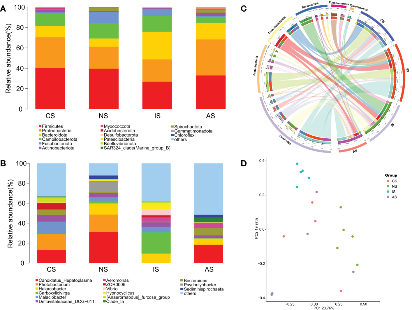At phylum level, the four groups of crab gut microbiomes were similar in composition, but had significant differences in relative abundance. The predominant phyla (relative abundance >5% at least in one group) shared by the four groups of crabs’ intestinal bacteria were Firmicutes, Proteobacteria, Bacteroidota and Campilobacterota (Figures 2A, S2). In the NS and IS groups, Fusobacteriota also accounted for a large proportion, accounting for 11.35% and 7.25%, respectively, whereas only 0.74% and 0.47% in the CS and AS groups. Bacteroidota had the highest percentage in the IS group, accounting for 27.10% (Figures 2A, S2A, C). Dependentiae was found exclusively in the CS group, and in extremely low abundance. Interestingly, the relative abundances of most phyla in the AS group were higher than that of the other three groups (Figure S3A). There were 682 genera identified in all, but only 20 genera had an abundance of more than 1%. At genus level, the four groups showed distinct bacterial community structure (Figure 2B). The relative abundance of Candidatus_Hepatoplasma was higher in NS (31.11%), CS (12.89%) and AS (18.02%), but very low in IS group (0.16%). The results indicated that Candidatus_Hepatoplasma may be an important gut bacterium in mariculture crabs. Photobacterium was abundant in the NS and CS groups, occupying approximately 17.39% and 15.96%, respectively, but lower in the IS and AS groups, accounting for just 0.04% and 0.47%. Carboxylicivirga (21.12%) and Candidatus Hepatoplasma (31.22%) were the most abundant in the IS and NS groups, respectively. In particular, Psychrilyobacter, accounting for the second-largest proportion in the NS group, which was essentially non-existent in the other groups (Figure 2B).