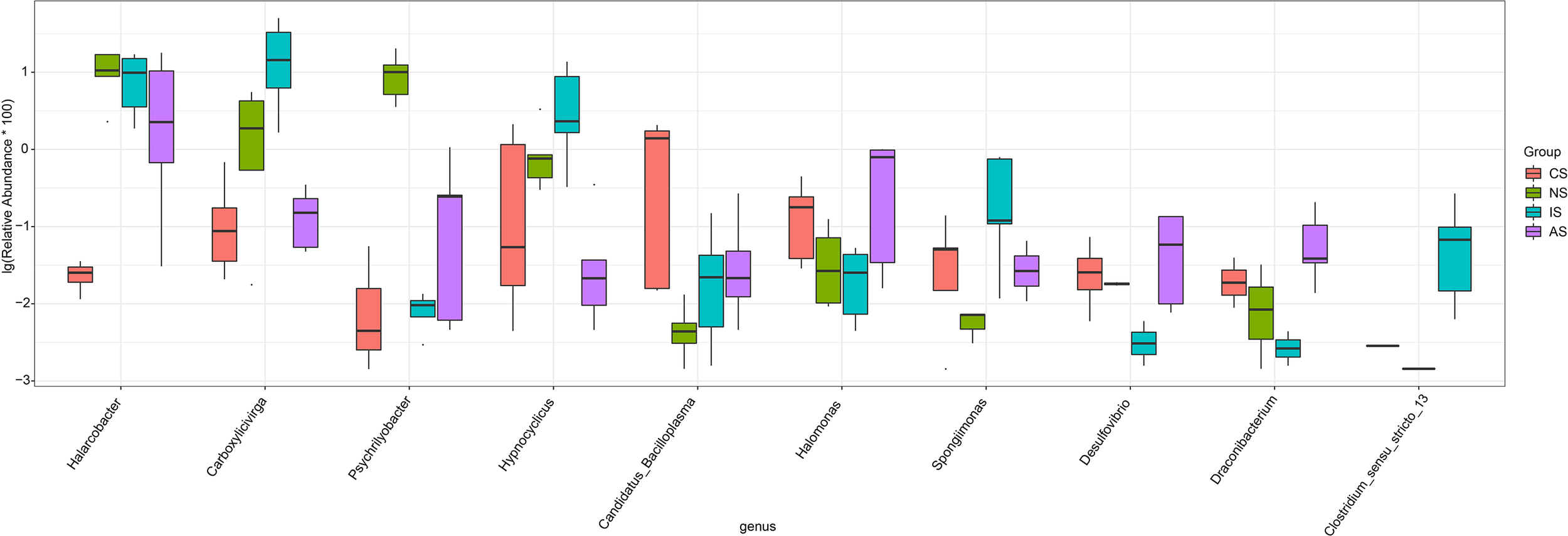 We found significant differences in gut bacterial community composition between IS and other groups (Figure 2C). In the PCoA, principal coordinate 1(PCo1) explained 23.76% of the variance (Figure 2D), indicating that the bacterial communities clustered according to the salinity, aside from CS and AS groups, and the IS group was separated clearly from the other groups. These finding suggested that saline-alkaline water may be the most important driver of variance in crab gut microbiota. ANOVA analysis was used to examine species that differed significantly across groups. There were 129 differential OTUs, belonging to 37 differential genera (Figure S4). Of the top 10 differential genera, Carboxylicivirga, Hypnocyclicus, Spongiimona and Clostridium_sensu_stricto_13 were significantly elevated in the IS group, while Desulfovibrio and Draconibacterium were significantly less abundant. In the NS group, the relative abundance of Psychrilyobacter was significantly increased. When compared to the other three groups, the relative abundance of Halarcobacter was significantly lower in the CS group, while the relative abundance of Candidatus Bacilloplasma was greatest in the CS group. In the AS group, the relative abundance of Draconibaterium was significantly increased (Figure 3).