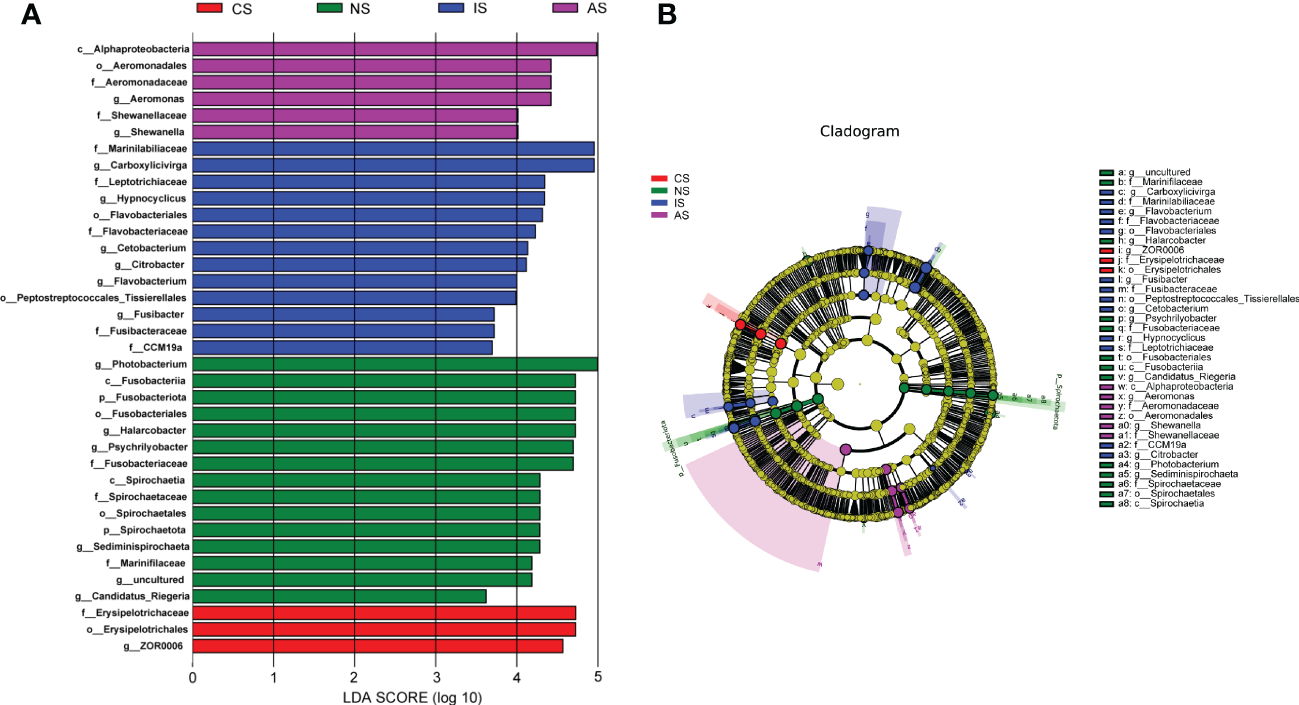 The ternary plot demonstrated that the dominating species at phylum level were distinct between three low salinity groups (Figure S5). Fusobacteriota had the largest proportion and relative abundance in the IS group, while Spirochaetota have the highest proportion in the AS group, indicating that Fusobacteriota may play an important role in IS group. Firmicutes, Proteobacteria, Bacteroidota and Campilobacterota were the dominant phyla shared by the three groups, which was the same as the above results. Meanwhile, the proportion of nine phyla were higher in the AS group, but the relative abundance was lower, indicating that the intestinal microbial of the AS group was disordered. LEfSe analyses was performed to identify differentially represented OTUs across four groups (Figure 4). The analysis revealed that there were 3, 15, 13, and 6 biomarkers (LDA score >3) in the CS, NS, IS and AS groups, respectively. The family Marinilabiliaceae and genus Carboxylicivirga made a significant contribution to the IS group. The top featured microbes in the NS and AS groups were genus Photobacterium and class Alphaproteobacteria, respectively. Logistic regression curve analysis indicated that the phylum Fusobacteriota and genus Carboxylicivirga were shown to be significantly positively correlated with salinity (P < 0.05, Figure S6).