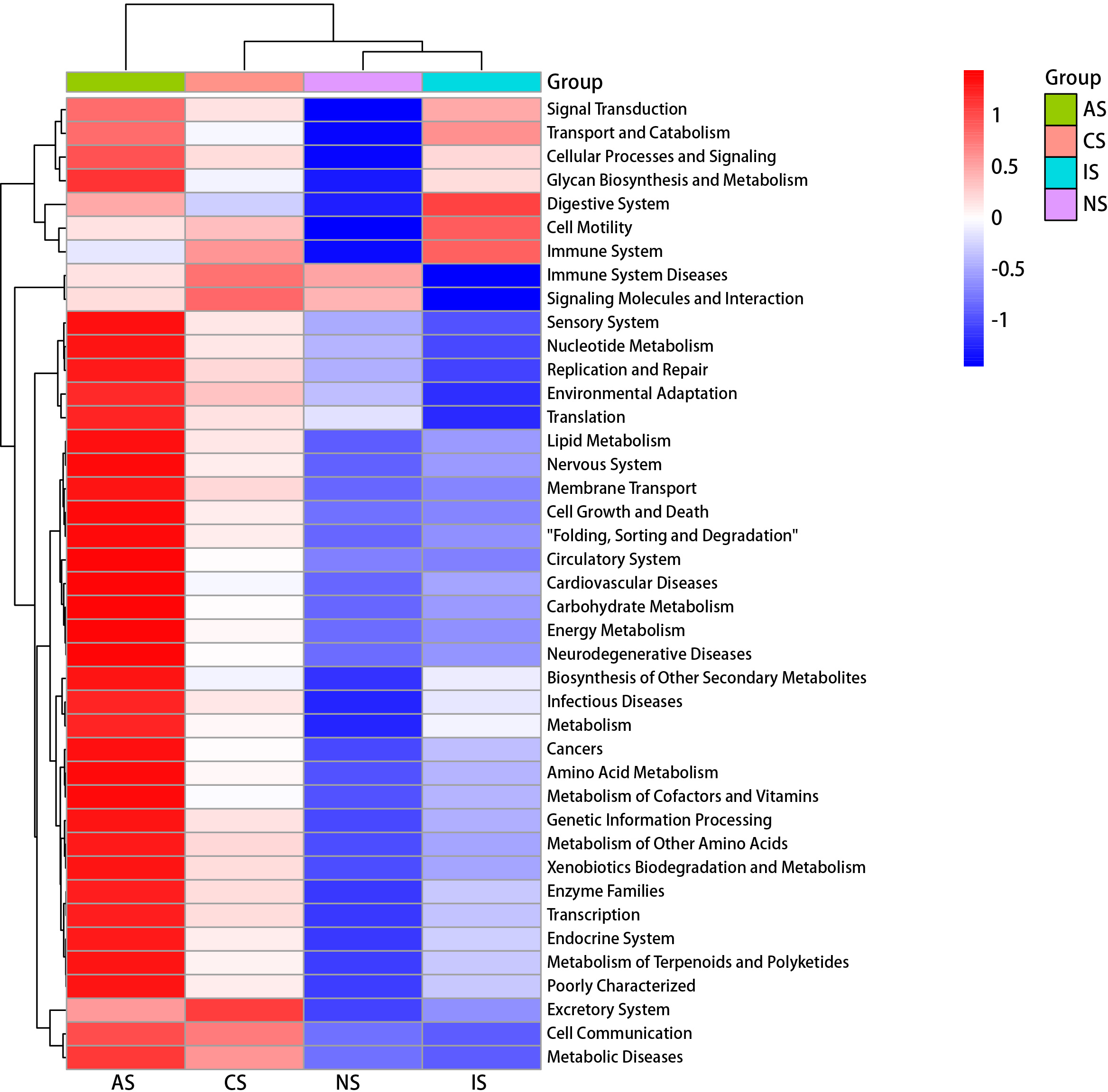 The function was predicted by PICRUSt2 to compare the functional potentials of crabs’ intestinal microbiota community under multiple low-salinity environments (Figure 6). A total of 41 functional pathways were predicted, and most of the pathways enriched in the AS group were significantly increased than those in other groups, especially amino acid metabolism, lipid metabolism, energy metabolism and environmental adaptation, while CS group was the next (Figure 6). The KEGG pathways in the IS group were significantly enriched in comparison to the NS group. For instance, the KEGG pathways involved in immune system, transport and catabolism, metabolism of terpenoids and polyketides, amino acid metabolism, and biosynthesis of other secondary metabolites increased in IS group compared with NS group, while the pathways involved in signaling molecules and interaction, and immune system diseases exhibited an opposite trend (Figure S7).