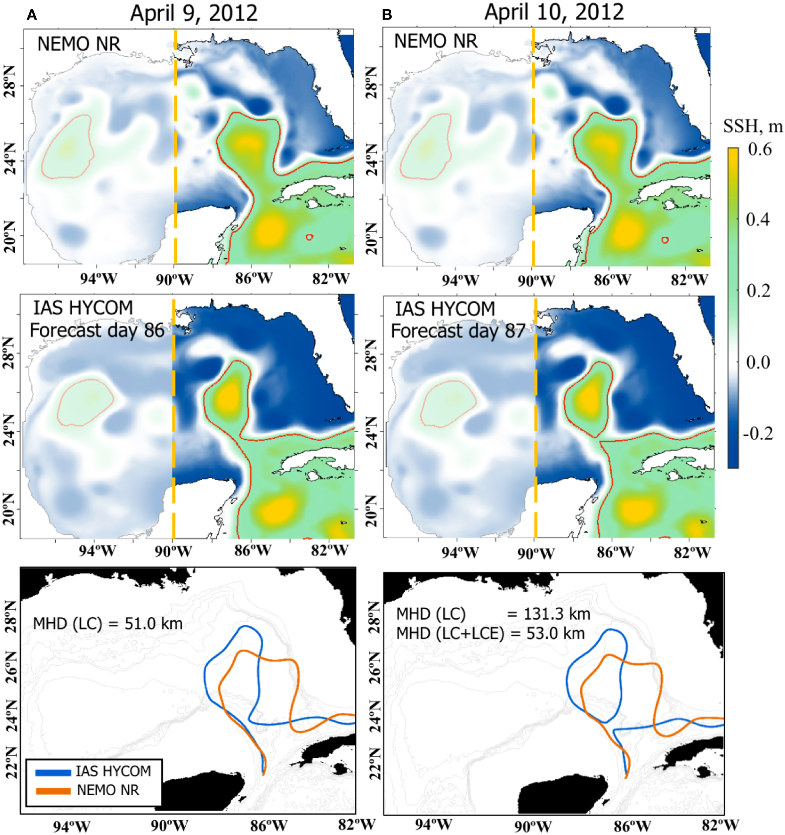 The SSH fields and the LC/LCE fronts from the NEMO NR (top row) and one of the 1/32.5° IAS HYCOM OSSE forecasts (middle) for April 9, 2012 (left column, A) and April 10, 2012 (right column, B). The red lines indicate LC/LCE fronts defined as the 17-cm contours of the demeaned SSH. The bottom panels show the LC/LCE fronts used for the MHD calculation with the MHD score listed. For the NR, only LCEs that are in the east of 90°W are considered for the MHD (the eddies that are in the shaded area are ignored). For (B), the two MHD scores of the forecast (blue) are given: for the LC front only and the LC with the LCE fronts combined.