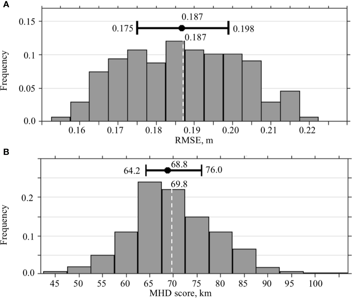 Statistics of the RMSE and MHD scores characterizing the saturation value. (A) Distribution of the RMSE between two randomly selected SSH fields form the NEMO NR. (B) Distribution of the MHD scores calculated for the LC/LCE fronts derived from randomly selected SSH fields from the NEMO NR. At the upper part of the diagrams, the median and IQR with the values are shown. The dashed white line is the expected value with the value listed at the top.