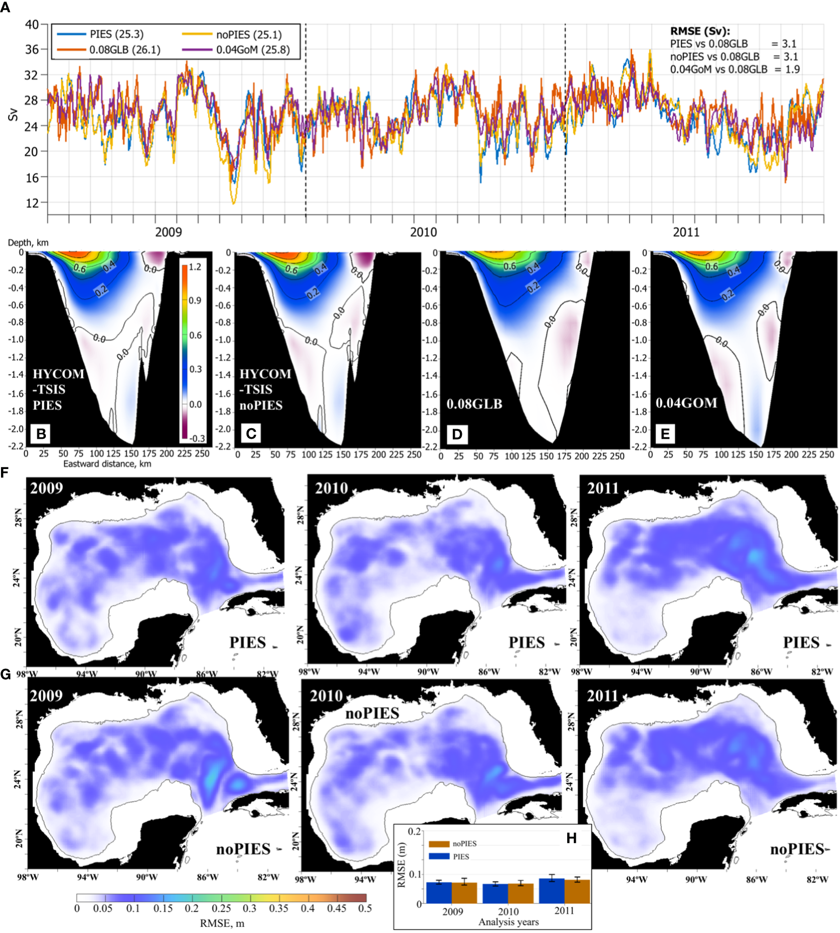 (A–E) Flow characteristics in Yucatan Channel from the 1/32.5° IAS HYCOM-TSIS OSEs, 0.08° Global HYCOM+NCODA reanalysis (0.08GLB), and 0.04° Gulf of Mexico HYCOM+NCODA reanalysis (0.04GOM). (A) Yucatan daily volume transport estimates (Sv). The mean volume transports over 2009–2011 are listed in parenthesis in the legend. On the right, RMSE (Sv) of the daily Yucatan transport estimates relative to the 0.08GLB is given. Vertical section of the mean along-channel velocity component (m s-1, positive northward) in the Yucatan Channel from: (B) the 1/32.5° IAS HYCOM-TSIS OSE with PIES T/S profiles assimilated in the hindcast; (C) 1/32.5° IAS HYCOM-TSIS OSE without PIES T/S profiles; (D) 0.08GLB reanalysis; (E) 0.04GOM reanalysis. In (B–E), the horizontal axis is the eastward distance (km) along the section (the Yucatan Shelf is on the left), the vertical axis is depth (km). (F) Annual RMSE between SSH (m) from the OSE analysis runs with assimilated PIES T/S profiles and from the 0.04GOM reanalysis for April 2009 – November 2011 (time interval of the PIES observations). (G) Same as (F) but OSE with no PIES T/S profiles. (H) Median and IQR of the RMSE from “PIES” and “noPIES” OSEs by years.