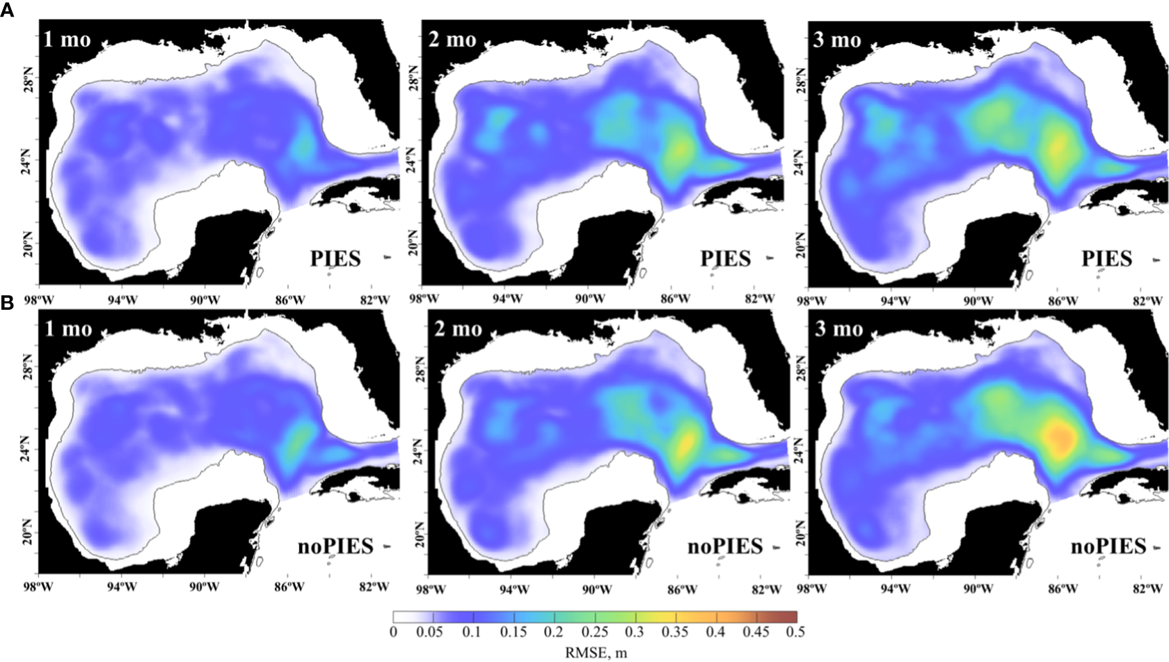 Monthly mean RMSE between daily SSH (m) from the OSE 3-month forecasts in 2009–2010 and from the 0.04GOM reanalysis. The forecasts initialized from the OSE with PIES T/S profiles (top row, A) and the OSE with no PIES T/S profiles (bottom row, B). The RMSE is averaged by the forecast months (in columns), so that the monthly statistics are derived from roughly 30 days of 20 forecasts.