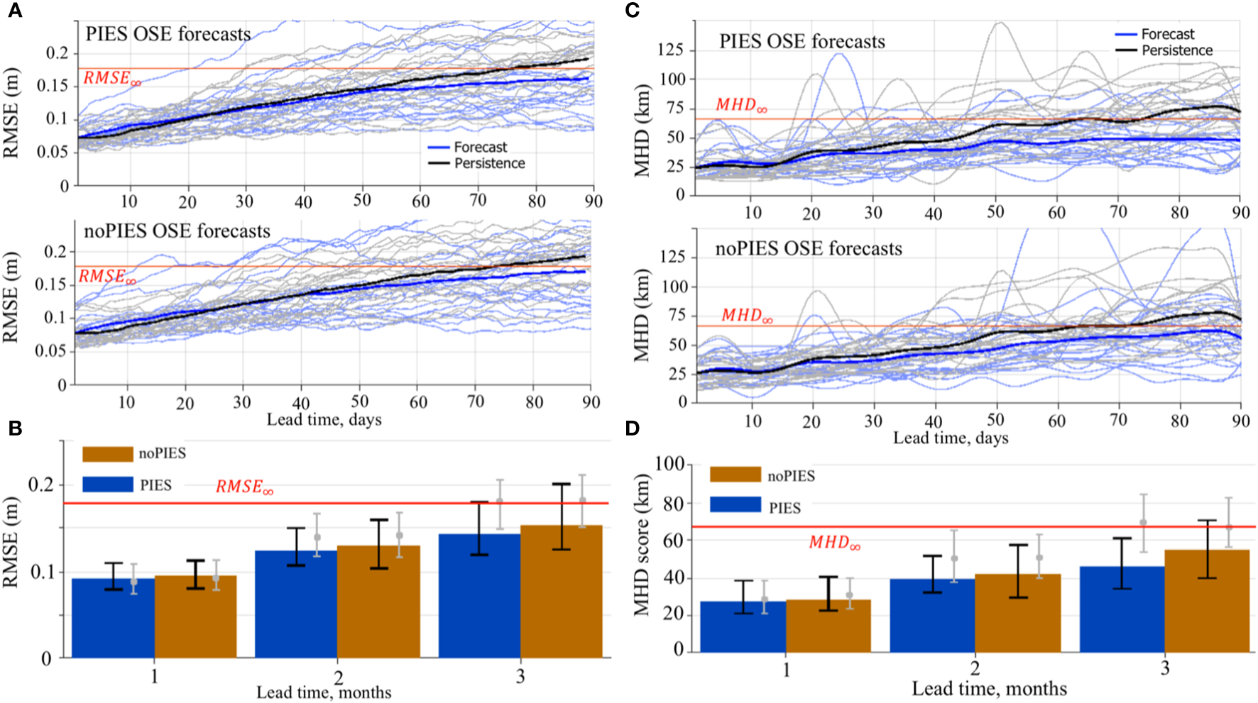 (A, B) RMSE (m) between SSH from the forecasts initialized from the “PIES” and “noPIES” OSE analysis runs and SSH from the 0.04GOM reanalysis. (A) RMSE of the individual 3-month forecasts (light blue) and corresponding persistency prediction (grey lines). The bold blue line is the mean RMSE over all individual forecasts. The black is the mean RMSE of persistency forecasts. The horizontal red line indicates RMSE∞ (95% of the saturation value). (B) The median (the colored bars) and the IQR (the black vertical lines) of the RMSE. The RMSE are grouped by the forecast months. The grey bullet and the vertical lines indicate the median and the IQR of the RMSE between the persistence and the 0.04GOM reanalysis. (C, D) MHD scores (km) of the OSE forecasts. The MHD is computed for the LC/LCE fronts derived from the SSH fields of the OSE forecasts and the 0.04GOM reanalysis. (C) MHD scores of the individual 3-month forecasts (light blue) and corresponding persistency prediction (grey lines). The bold blue line is the mean MHD over all individual forecasts. The black is the mean MHD of persistency forecasts. The horizontal red line indicates MHD∞. (D) Median (bars) and the IQR (the black vertical lines) of the MHD scores of the OSE forecasts grouped by the forecast months. The grey bullet and the vertical lines indicate the median and the IQR of the MHD of the persistence.
