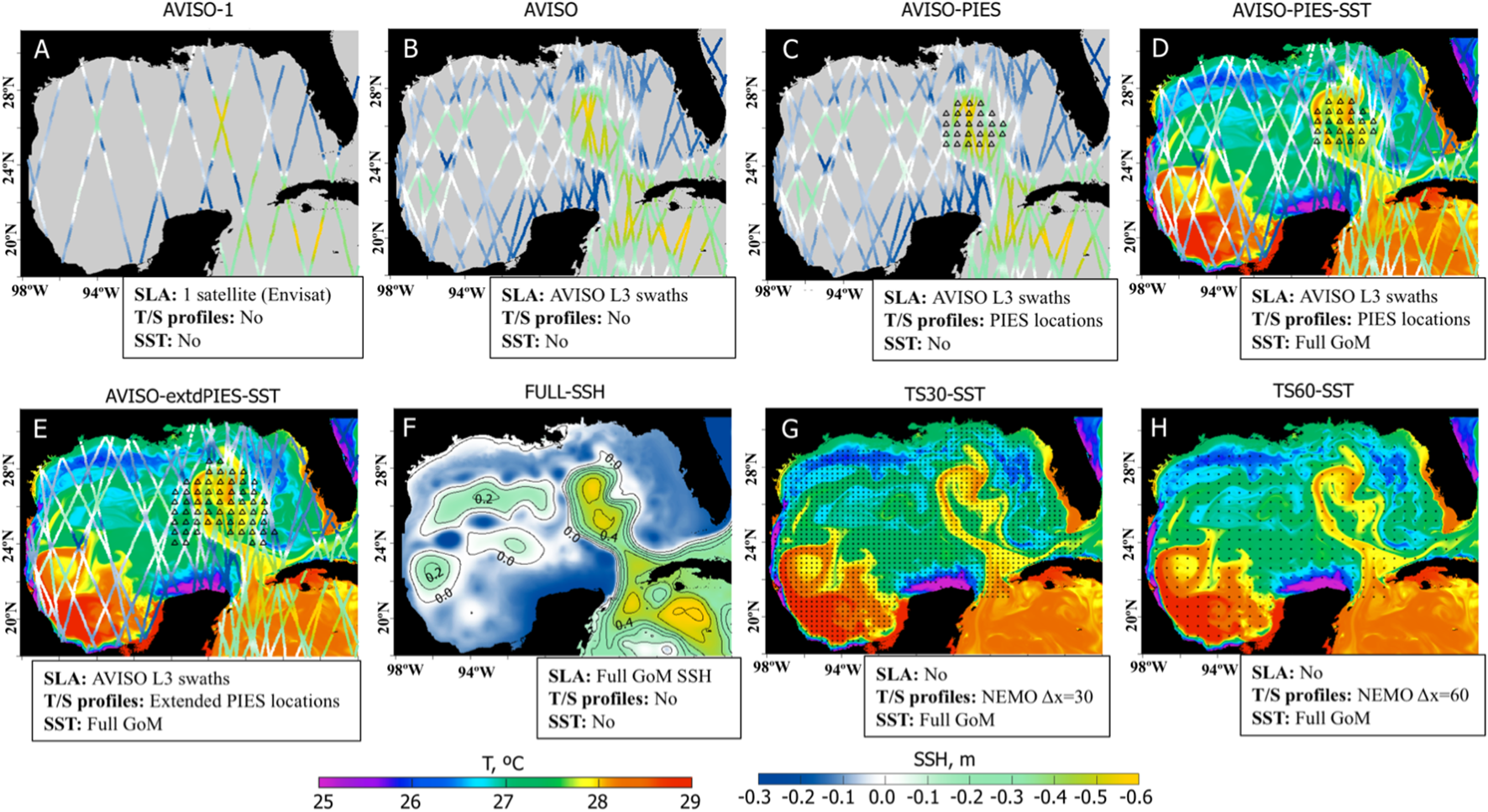 The last group combines idealized cases when unlimited information is available for constraining the 1/32.5° IAS HYCOM simulation. In hindcast “FULL-SSH”, complete information about the sea surface height (SLA from the NR) is provided to the data assimilation algorithm (Figure 7F). In the two other hindcasts (“TS30-SST” and “TS60-SST”), only subsurface T/S fields and SST are assimilated and no SLA fields are used. For these hindcasts, the T/S profiles are derived from the NR at every 30th (Figure 7G) and 60th (Figure 7H) NEMO grid points in the GoM. Thus, the two hindcasts differ in the density of T/S profiles over the GoM.