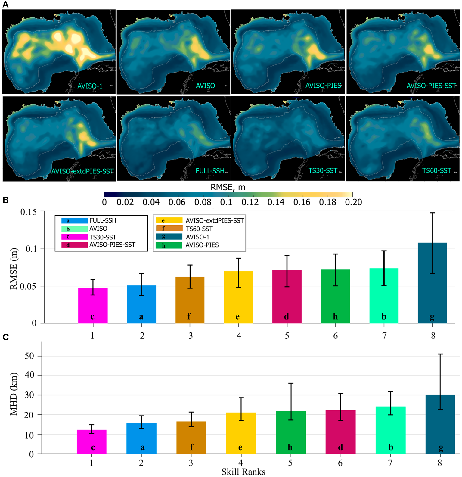 (A) Maps of mean RMSE (m) between daily SSH fields from the OSSE analysis runs shown in Figure 7 and from the NR (NEMO). The RMSE is averaged over 2011–2012. The gray contour is the 200-m isobath. The OSSEs are indicated in the maps. (B) RMSE (m) between SSH from the OSSE analysis runs and the NR over the hindcast period (2011–2012). The colored bars show the median RMSE with colors corresponding to the OSSEs. The hindcasts are ranked based on the median RMSE. The vertical black lines indicate the IQR. The letters in the bars are for ease of color identification. (C) MHD scores computed for the LC/LCE contours derived from the OSSE analysis SSH fields versus the NEMO NR. The bars show the median MHD scores by OSSEs. The hindcasts are ranked based on the median MHD score.
