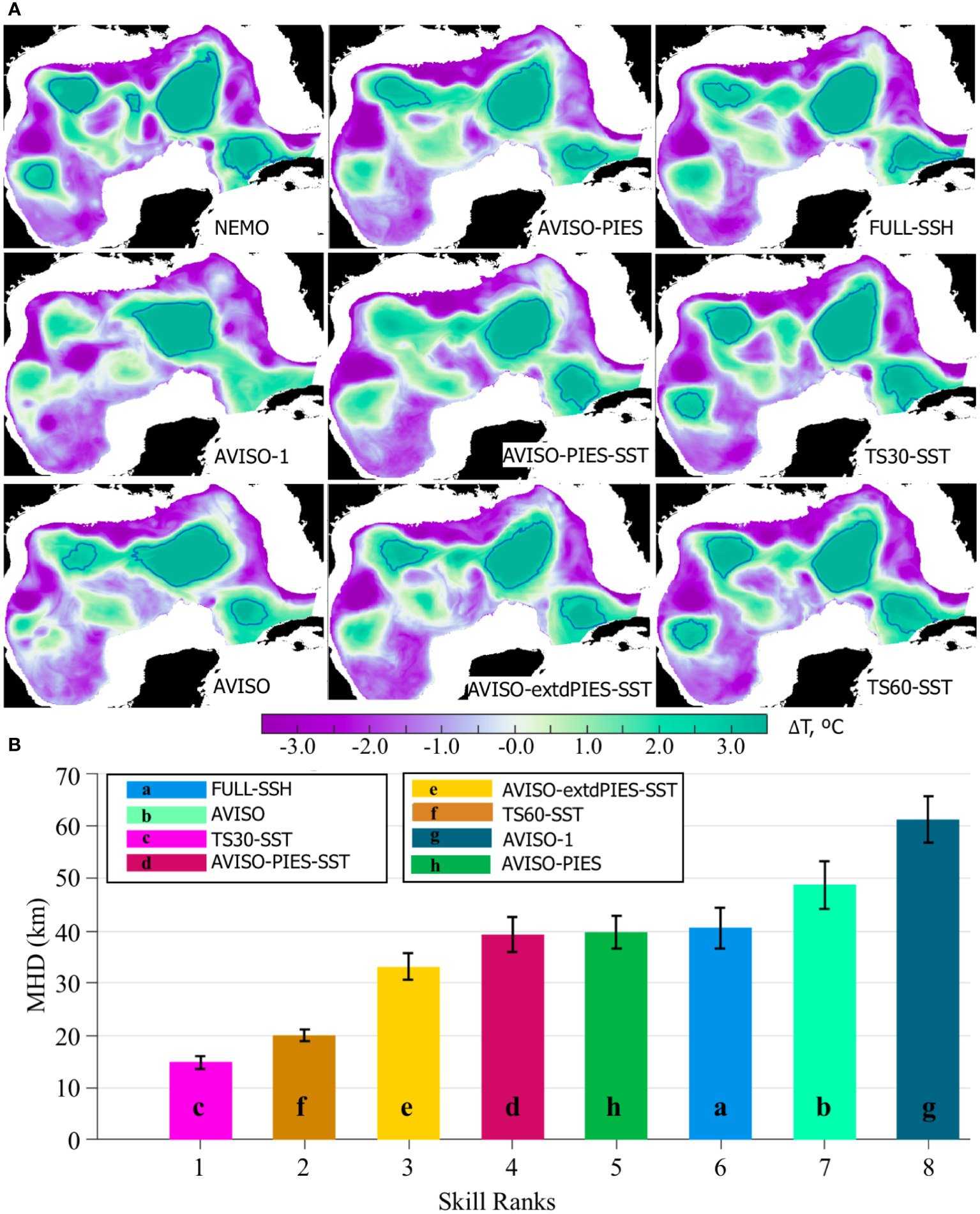 (A) Temperature anomaly (ΔT) at -200 m on July 9, 2011 from the NEMO NR and OSSE analysis. The contours delineate ΔT=2.5 °C isoline that tracks anticyclones and the LC. (B) MHD scores computed for the 2.5 °C contours of ΔT at -200 m (2011-2012) derived from the OSSE analysis fields and the NEMO NR. The colored bars are the medians with colors corresponding to the OSSE hindcasts. The hindcasts have been ranked based on the median MHD. The vertical black lines on top of the bars indicate the IQR.