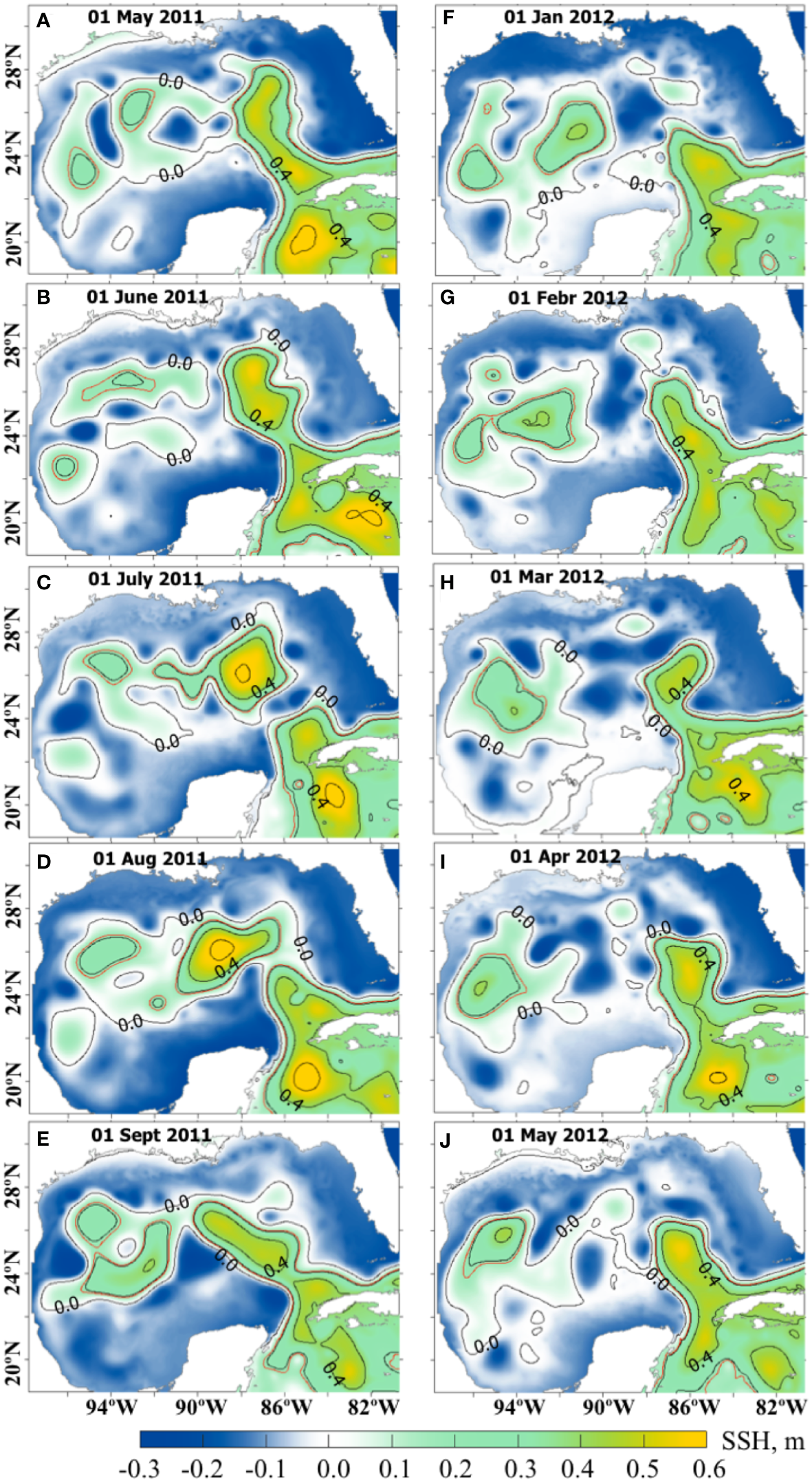 Daily SSH fields (m) from the NEMO NR. The left column (A–E) are SSH fields from May (A) – September (E) 2011 corresponding to the active state of the LC with several detachments and reattachments of the LCE. The right column (F–J) are SSH fields from the time interval January (F) –May (J) 2012 during which the LC is in a more stable position. Contours are every 0.2 m starting from 0. The red line is the 0.17 m contour used as a definition of the LC and LCE fronts.