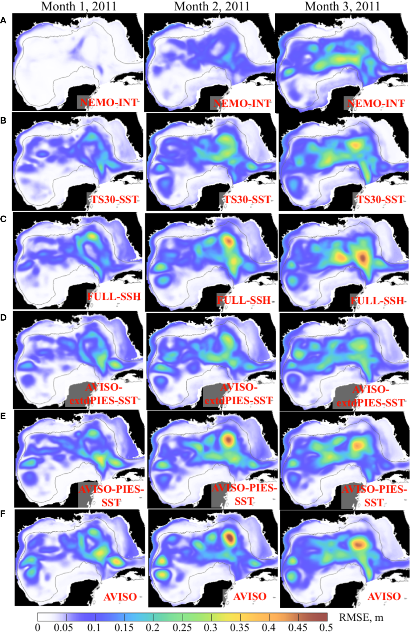Monthly mean RMSE between SSH (m) from the 3-month OSSE forecasts started in May – June 2011 and the NEMO NR. The RMSE for months 1 through 3 are in the columns. The OSSE forecast groups are shown in the rows (A–F) with the forecast names shown in the maps.