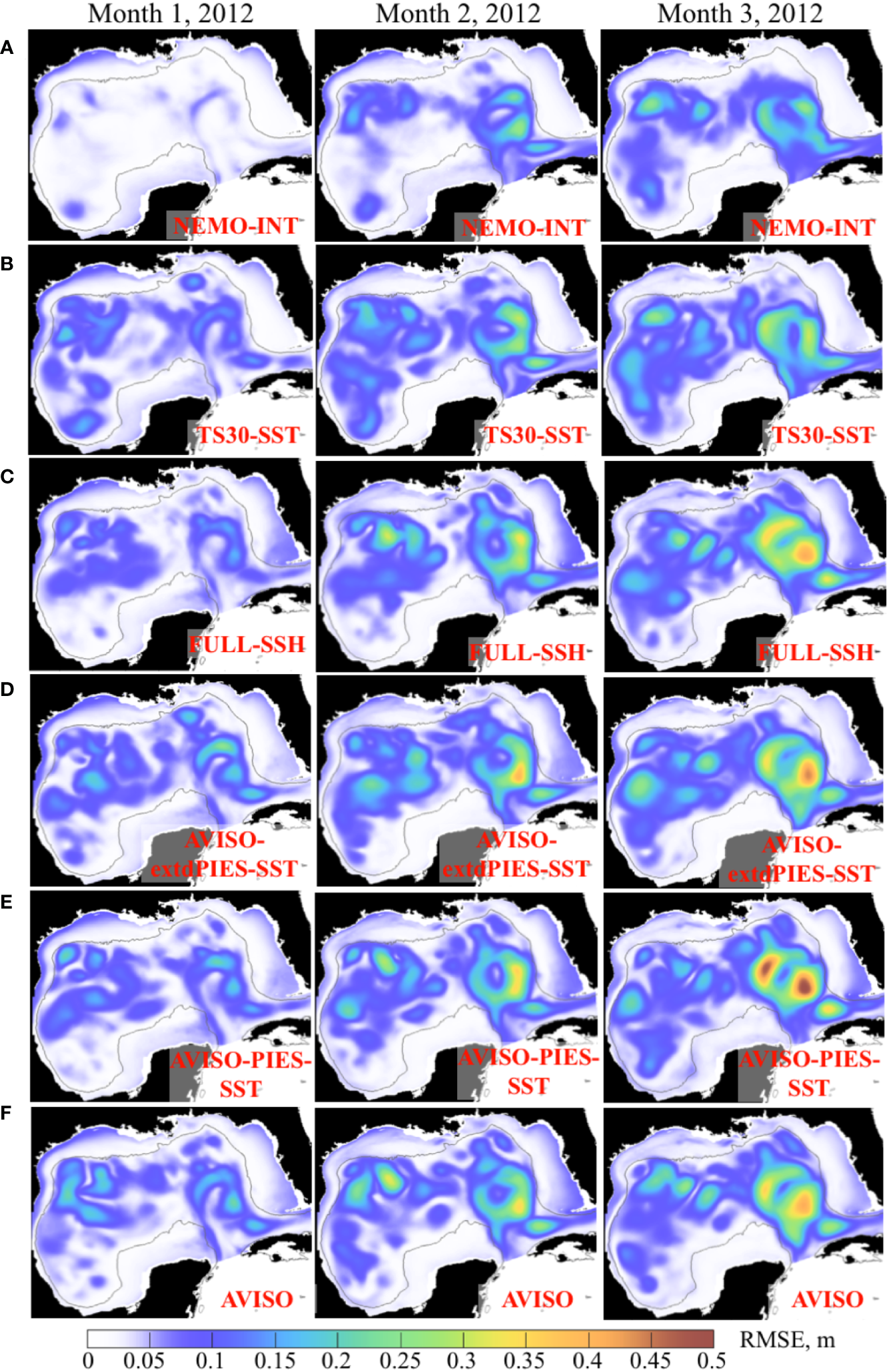 Monthly mean RMSE between SSH (m) from the 3-month OSSE forecasts started in January – February 2012 and the NEMO NR. The RMSE for months 1 through 3 are in the columns. The OSSE forecast groups are shown in the rows (A–F) with the forecast names shown in the maps.